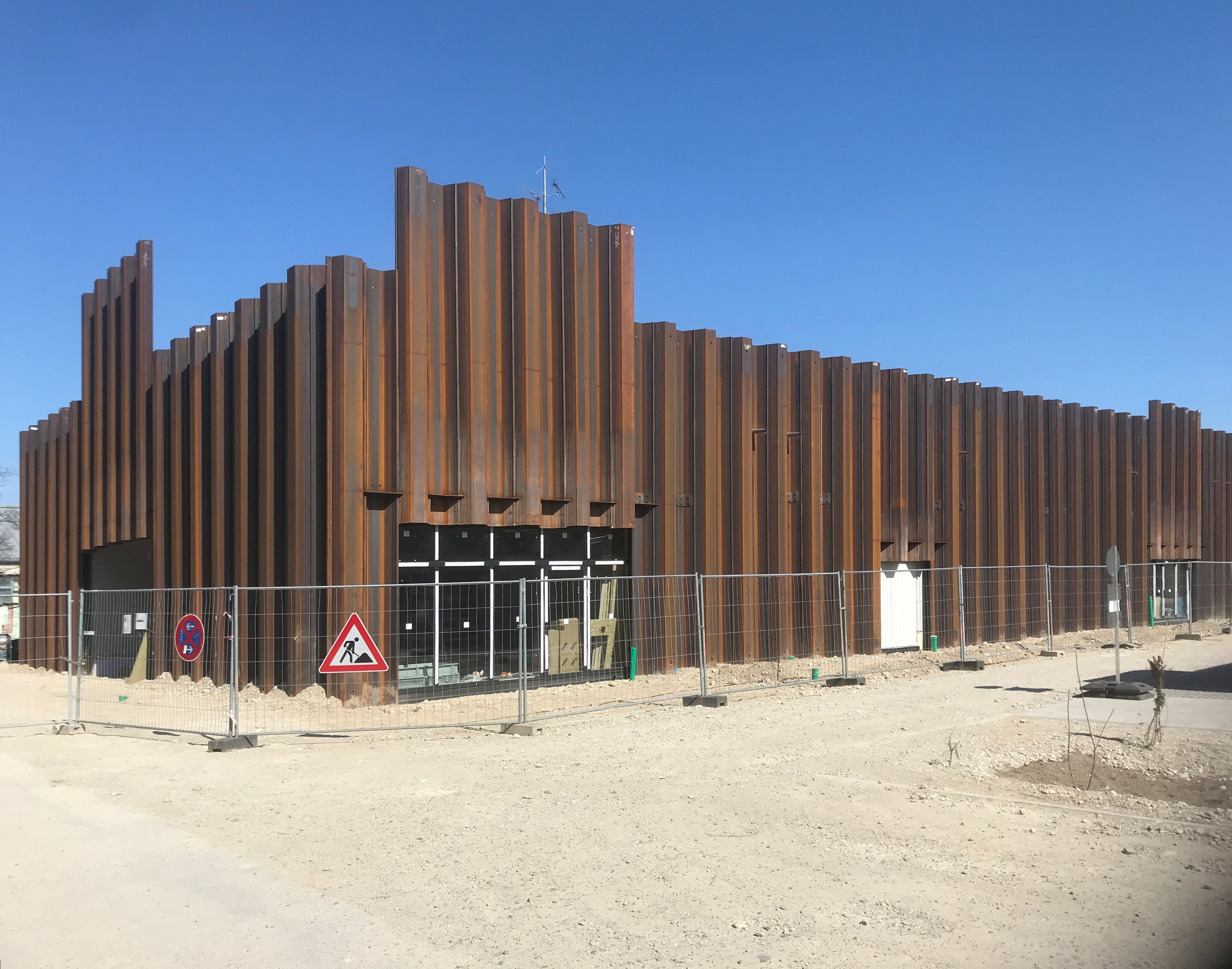 Aber: es ist immer ein Stückchen Innovation dabei. Und wenn dies in einer Stadt wie München passiert, deren Bewohner ja nicht gerade durch architektonische Neuigkeiten im Übermaß belästigt werden, tut ein Gebäude, wie das neue „Kreativlabor im Kreativquartier“ richtig gut. Die Fassade aus Spundwänden (also materiell hoffnungslos überzogen) mit den Überhöhungen an den Ein- und Ausgängen, steht so überzeugend im Kies, so beiläufig massiv und doch mit dem Geruch einer Zwischenlösung, eines vorübergehenden Zustandes. Die Fernwirkung von der Straße aus ist so interessant und einladend, man kann schlicht nicht anders – man muss hinlaufen und sich das „Ding“ anschauen. Der Kontrast zu dem äußerst banalen „tetrisartigen Container-Gewürfel“ gleich nebenan ist so wohltuend, dass man auch wieder den Glauben an Münchener Bauherrenschaft gewinnen kann. Was nicht immer leicht fällt.