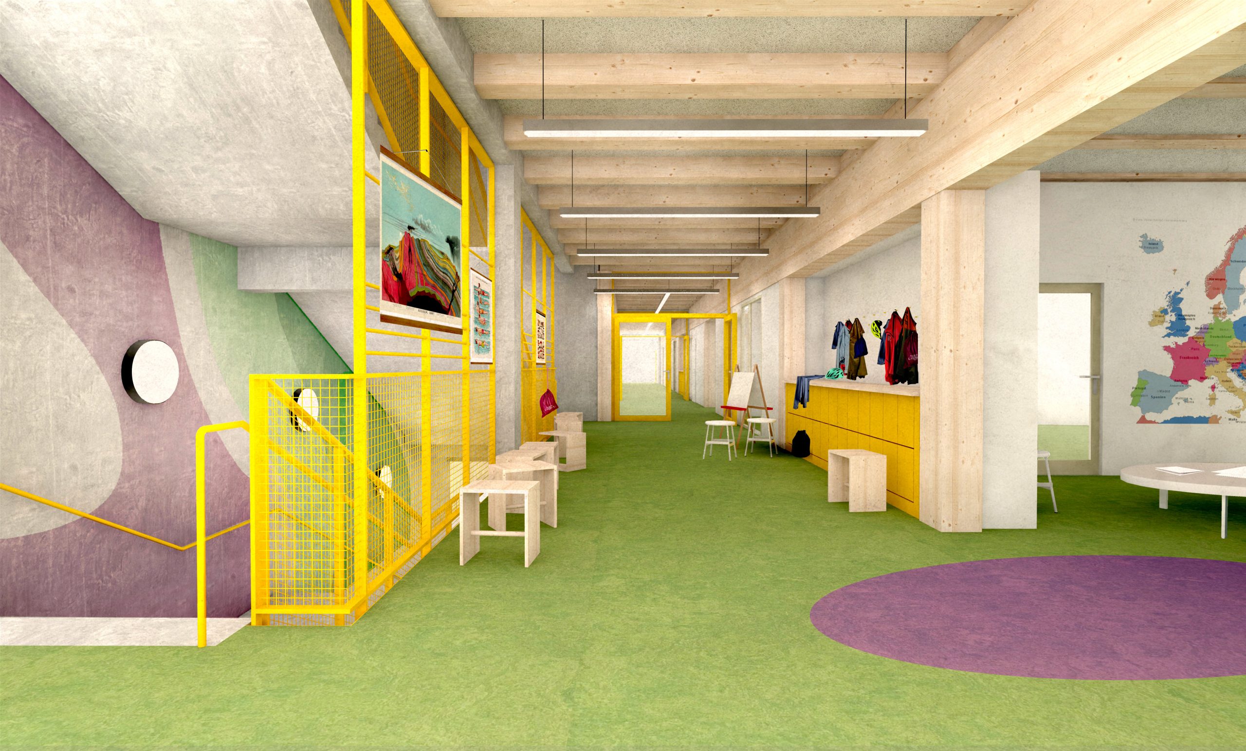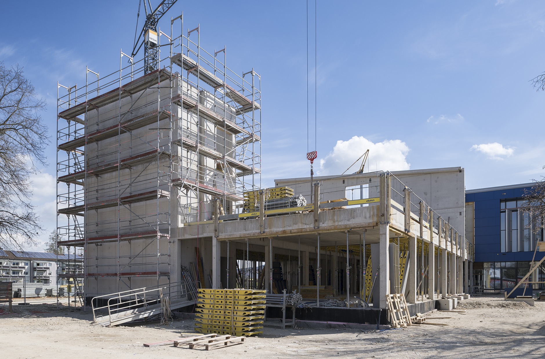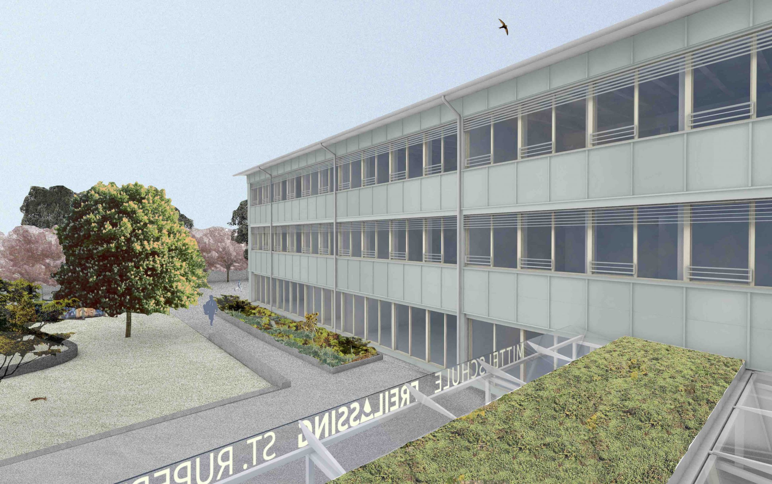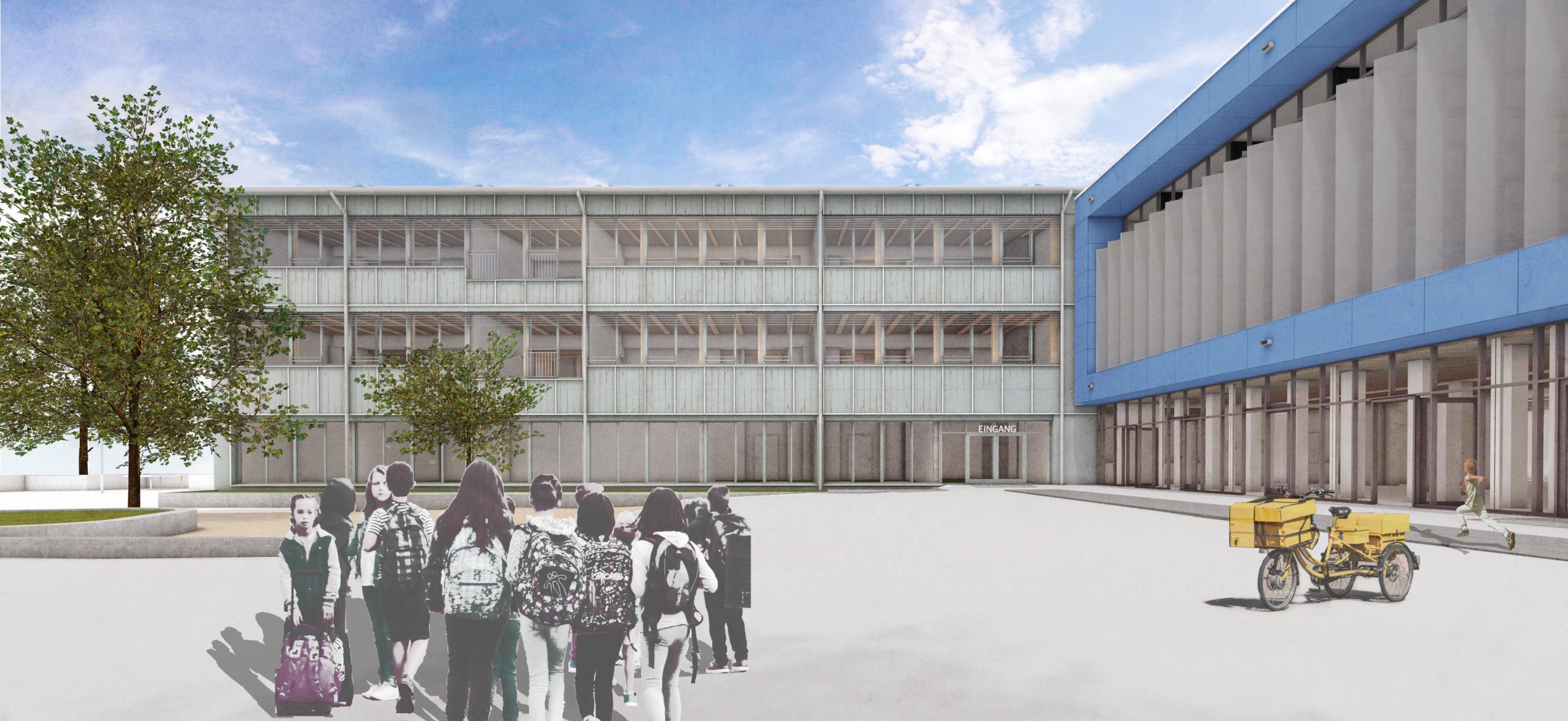 Die Mittelschule St.Ruppert in Freilassing soll einen neuen Anbau erhalten. Durch steigende Schülerzahlen und einen Bedarf an Ganztagesbetreuung soll der Standort nachverdichtet werden. Unser Entwurf sieht einen Hybridbau vor. Durch die Vorfertigung der Fassaden- und Deckenelemente und einer getaktete Anlieferung, ist eine schnelle Montage möglich.