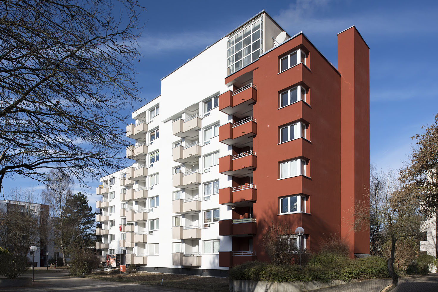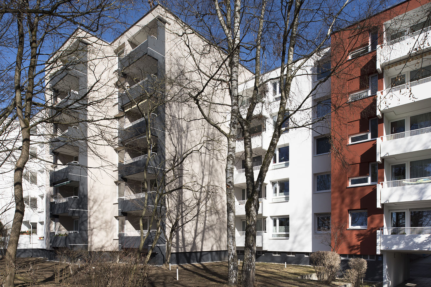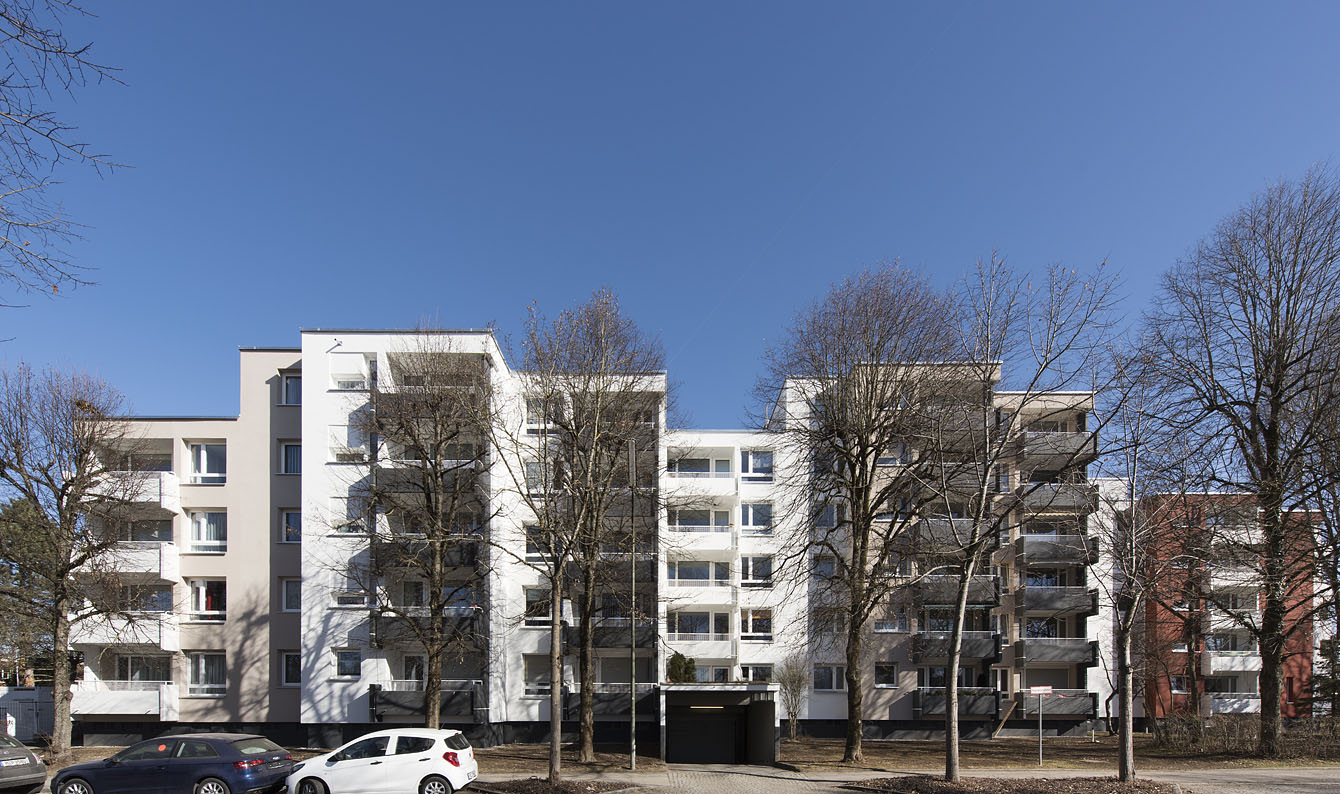 Heute, ca. 45 Jahre später, bedarf es einer Sanierung der Bauten aus dieser Zeit. Nicht nur neue Anforderungen an Komfort, Wärme-, Schall- und Brandschutz, sondern auch die in die Jahre gekommene Bausubstanz machen dies notwendig. Die hinterlüftete Fassadenhülle aus Faserzementplatten wurde vollständig zurückgebaut und ein vollflächiges, mineralisches WDVS angebracht. Eine thermische Trennung der Balkone war zur damaligen Zeit nicht üblich.