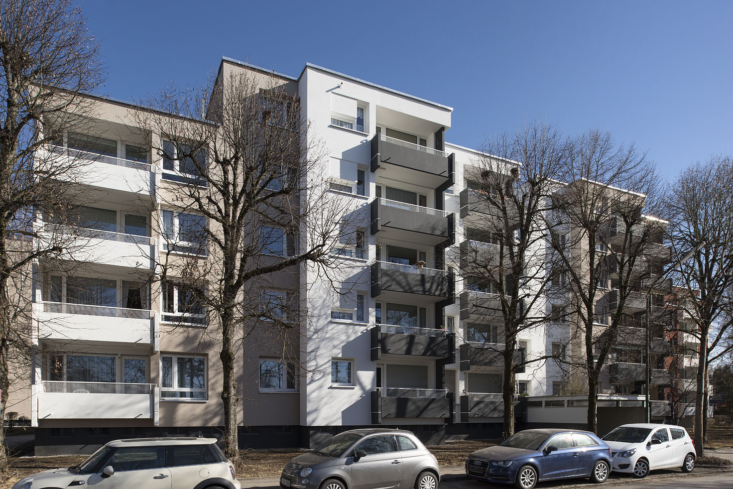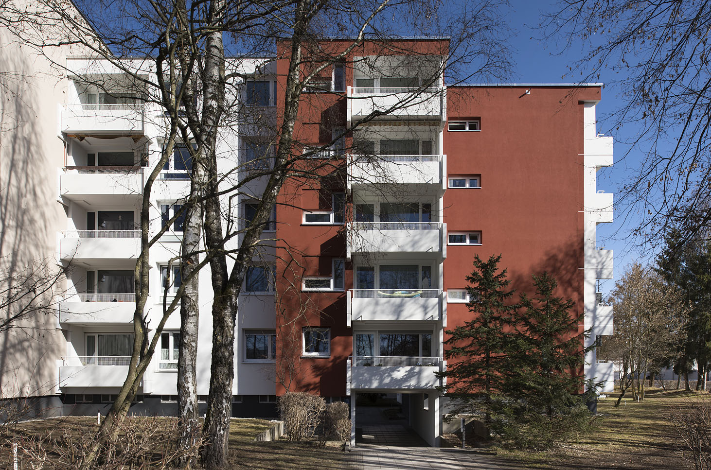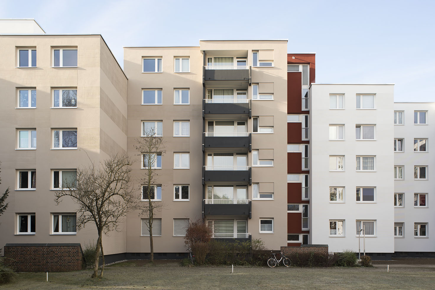 Heute, ca. 45 Jahre später, bedarf es einer Sanierung der Bauten aus dieser Zeit. Nicht nur neue Anforderungen an Komfort, Wärme-, Schall- und Brandschutz, sondern auch die in die Jahre gekommene Bausubstanz machen dies notwendig. Die hinterlüftete Fassadenhülle aus Faserzementplatten wurde vollständig zurückgebaut und ein vollflächiges, mineralisches WDVS angebracht. Eine thermische Trennung der Balkone war zur damaligen Zeit nicht üblich.