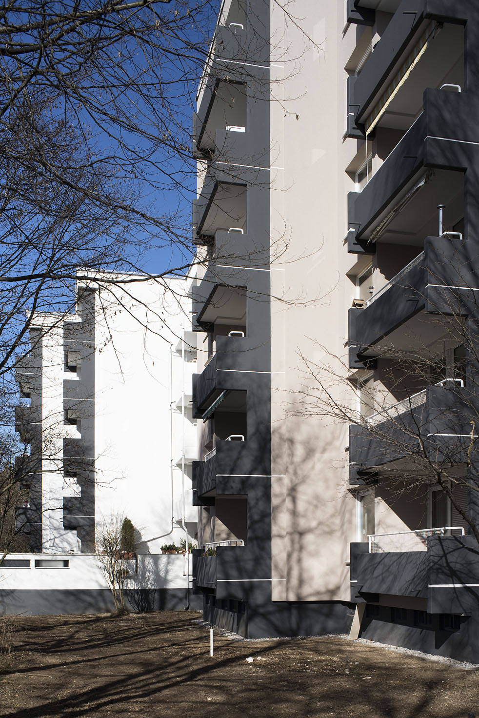 Aus dieser technischen Notwendigkeit heraus, entwickelten gerstmeir inić architekten ein Sanierungs- und Gestaltungskonzept. Flankendämmungen führen eine sekundäre, gestalterische Bauteilschicht ein, die z. B. die Kragplatten der Balkone profiliert. In Bereichen, in denen unterschiedliche Bauteile aufeinander treffen, verjüngen sich die Dämmungen und schaffen dadurch einen neuen gestalterischen „Layer“.