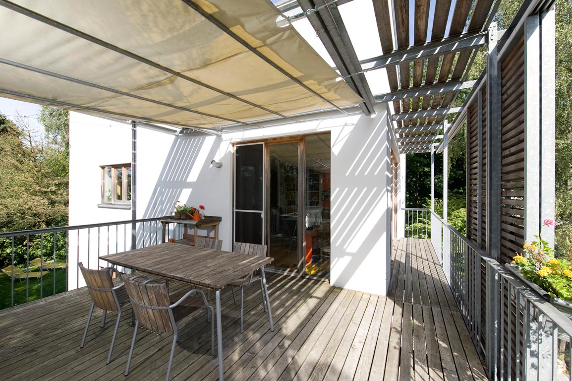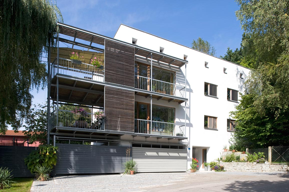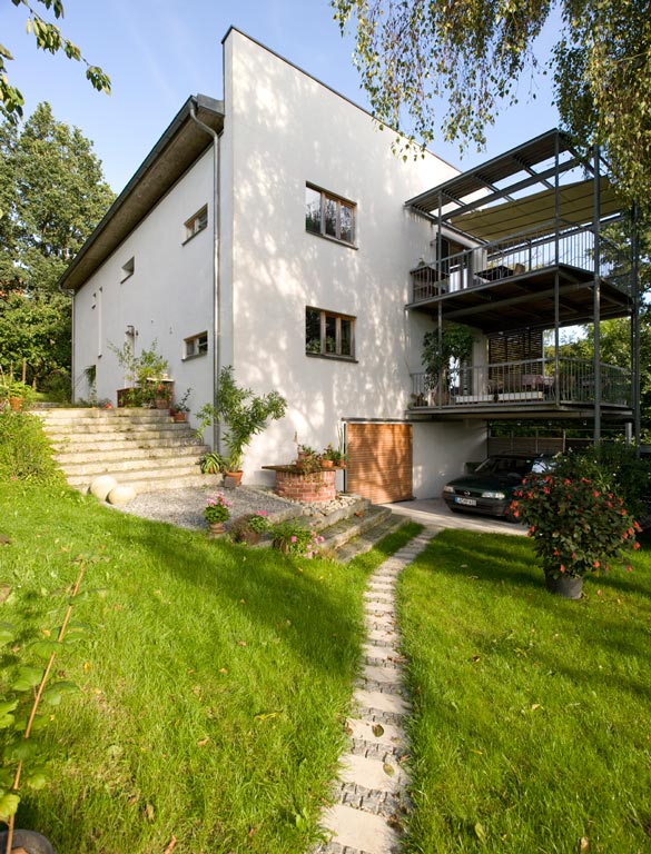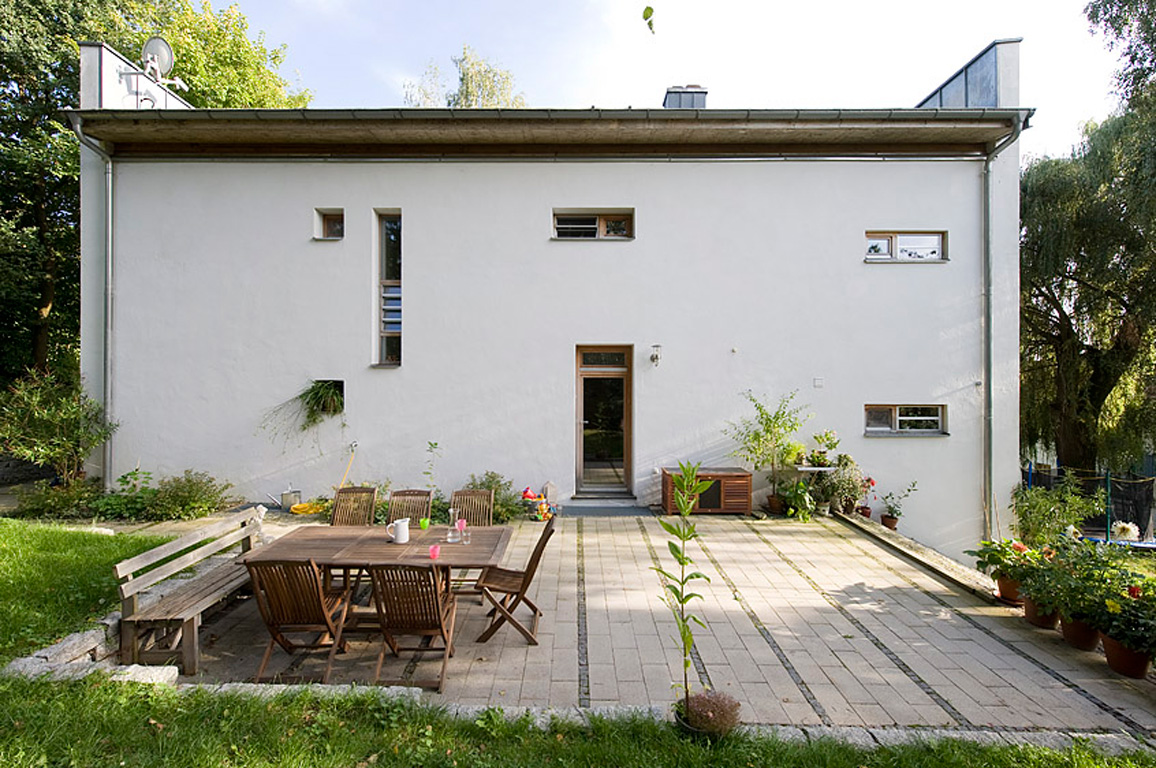 Inmitten einer gewachsenen Dorfstruktur entstand einen Generationenhaus. Im Kontext eines Schulgebäudes aus der Jahrhundertwende wurde das Hanggrundstück mit einem weissen Kubus aus klassischem Mauerwerk besetzt. Ein grosser Balkonanbau an der Süd-West-Ecke des Hauses dient als Raumerweiterung und schafft einen dem Dorf zugewandten Ort mit Ausblick in die umgebende Landschaft. Die Krone einer bestehenden Trauerweide, der „Hausbaum“, bietet Schutz vor starken Westwinden. Das Thema der gestaffelten Gebäudekubatur wiederholt sich in der Gestaltung der Freianlagen
