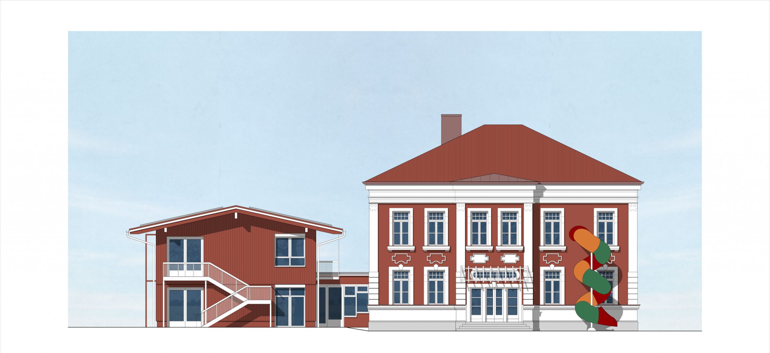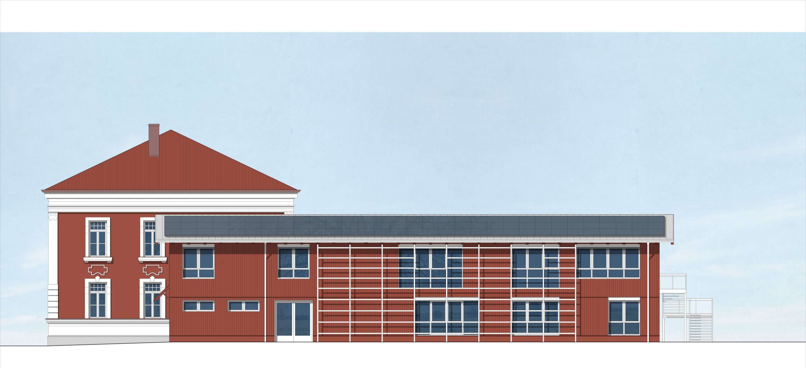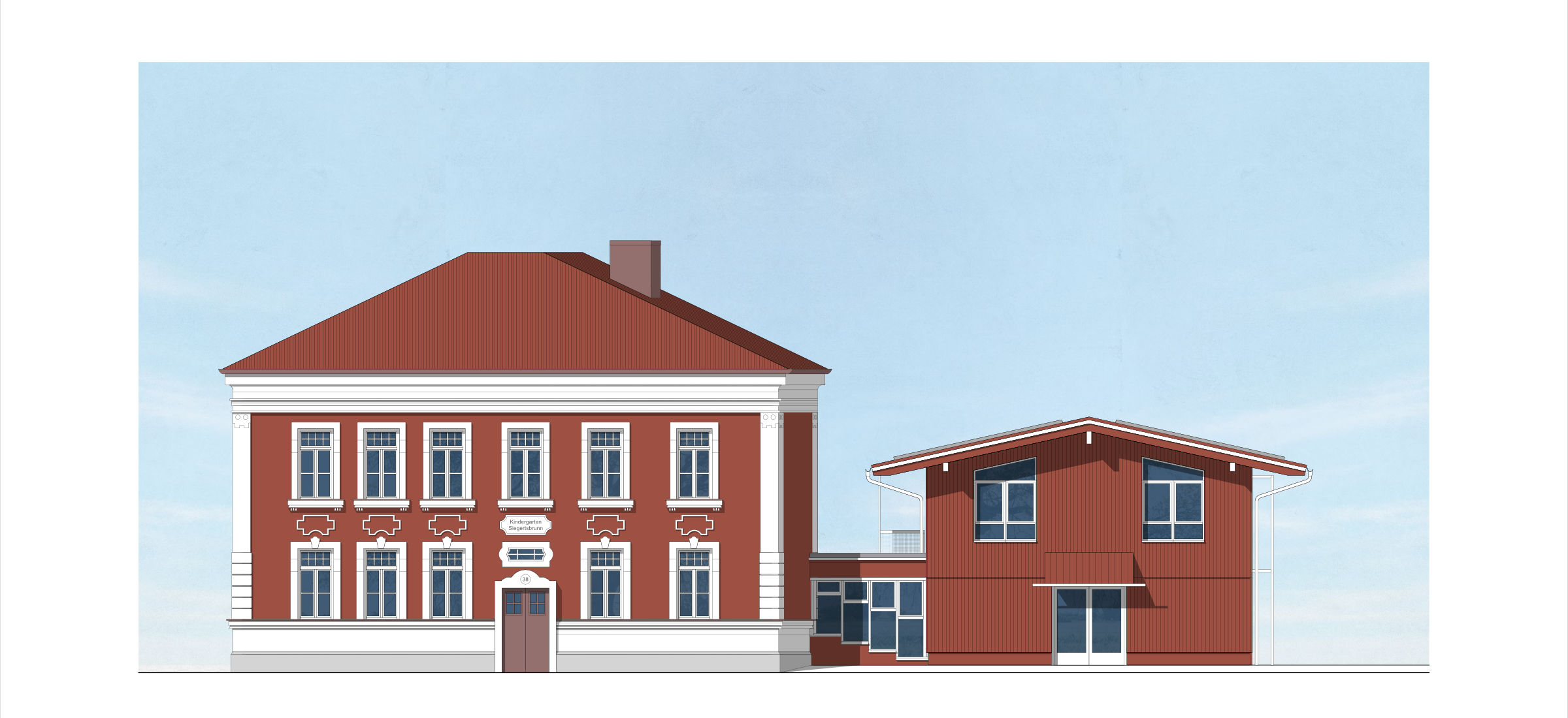 Durch das Wegrücken des Neubaus von der Bahnhofstrasse entsteht zudem ein Vorplatz vor der Kita, der durch den Neubau und durch das historische Gebäude räumlich gefasst wird.