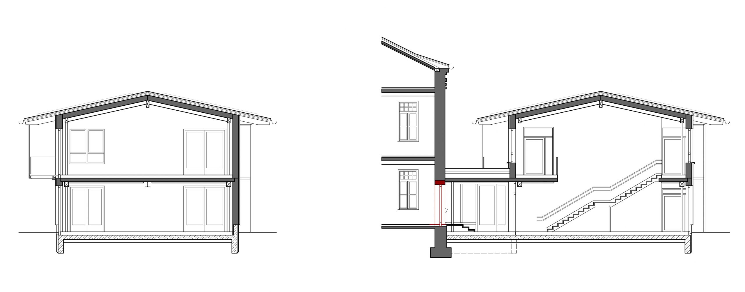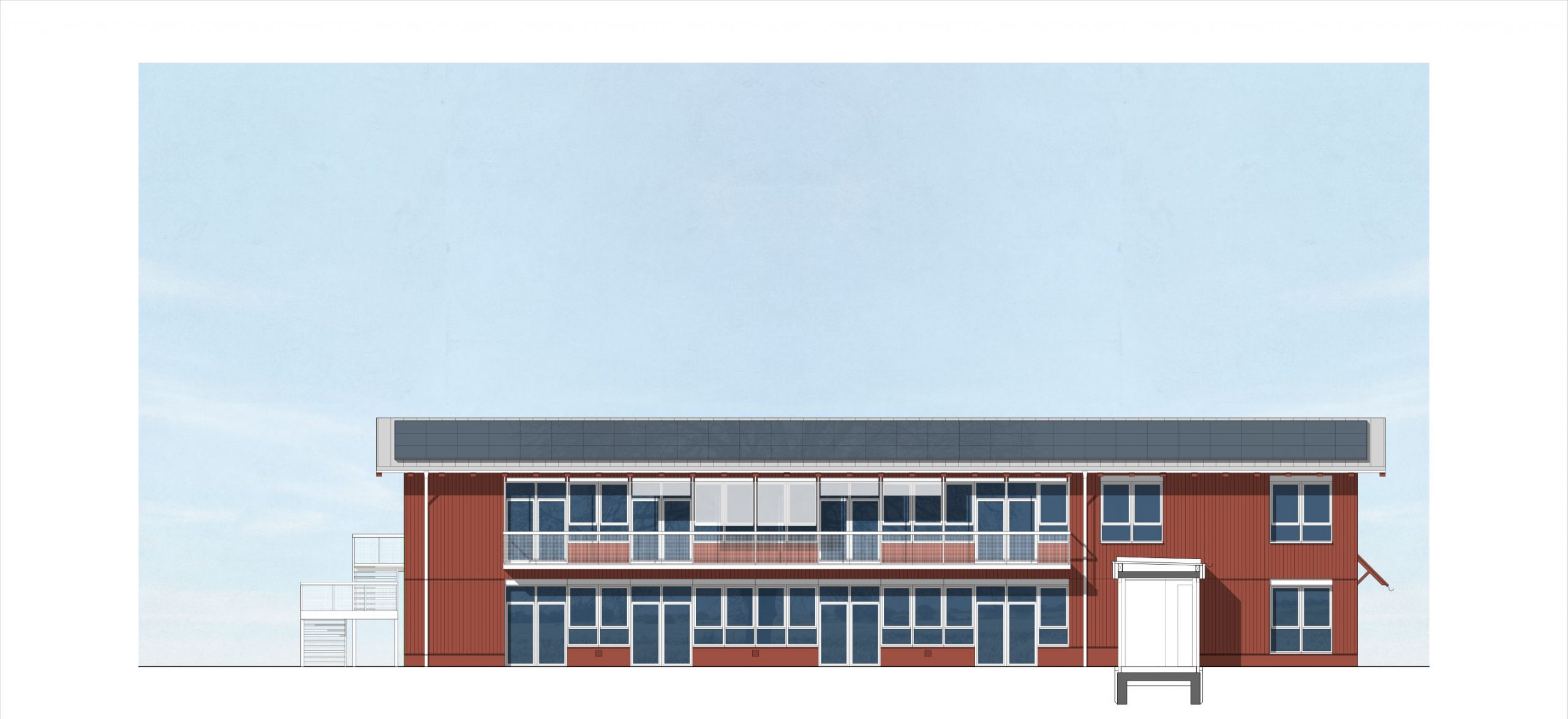 Alle tragenden Bauteile im EG und OG werden als Holzskelett mit Stahlstützen erstellt. Die Holzdecke über dem Erdgeschoss wird als Brettsperrholzdecke und das Dach als Pfettendach mit Blecheindeckung ausgeführt. Die Aussenwände werden als Holztafelwände mit hinterlüfteter, vertikaler Holzschalung ausgeführt. Auf dem flach geneigten Satteldach wird eine PV-Anlage ausgeführt.
