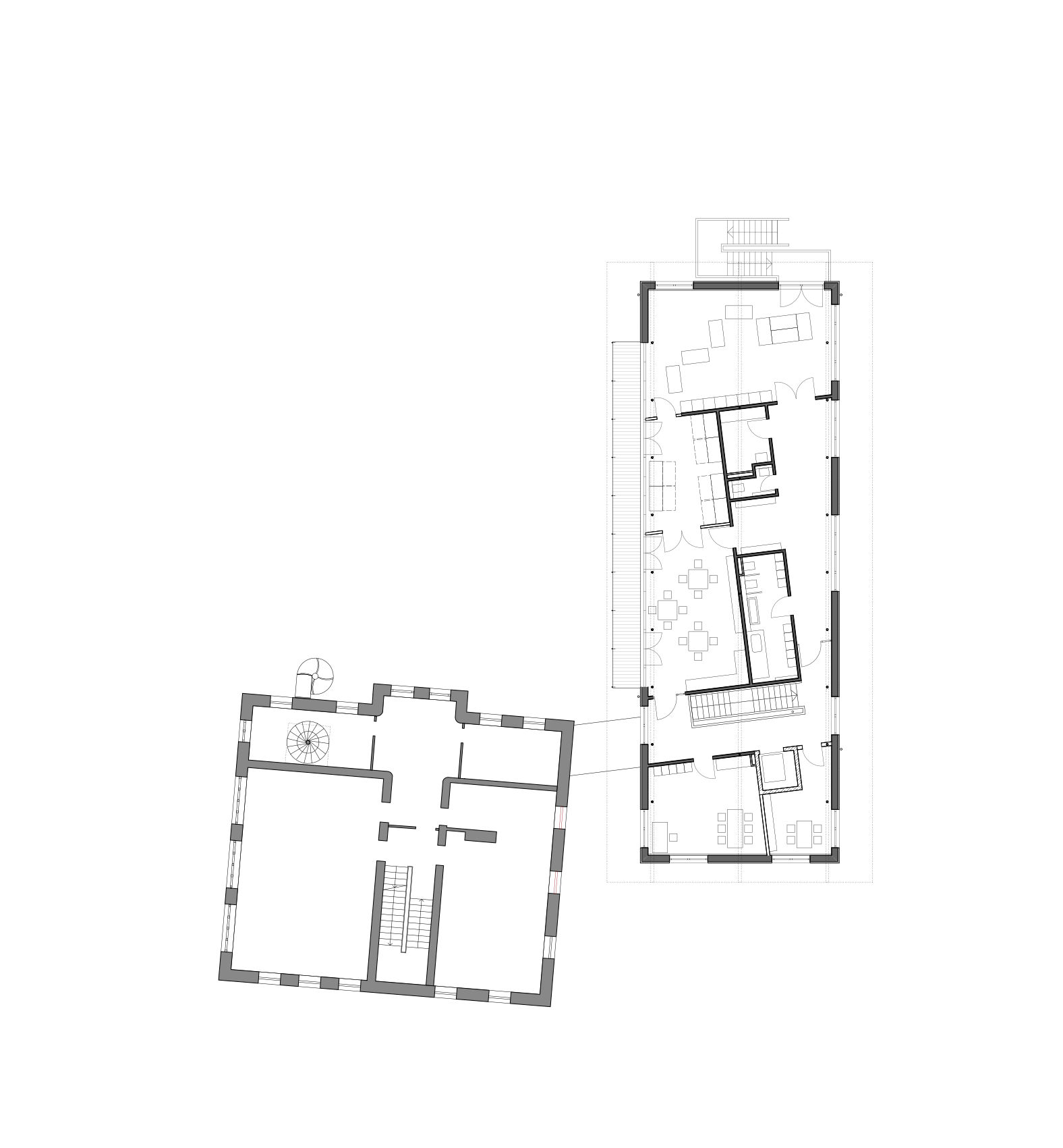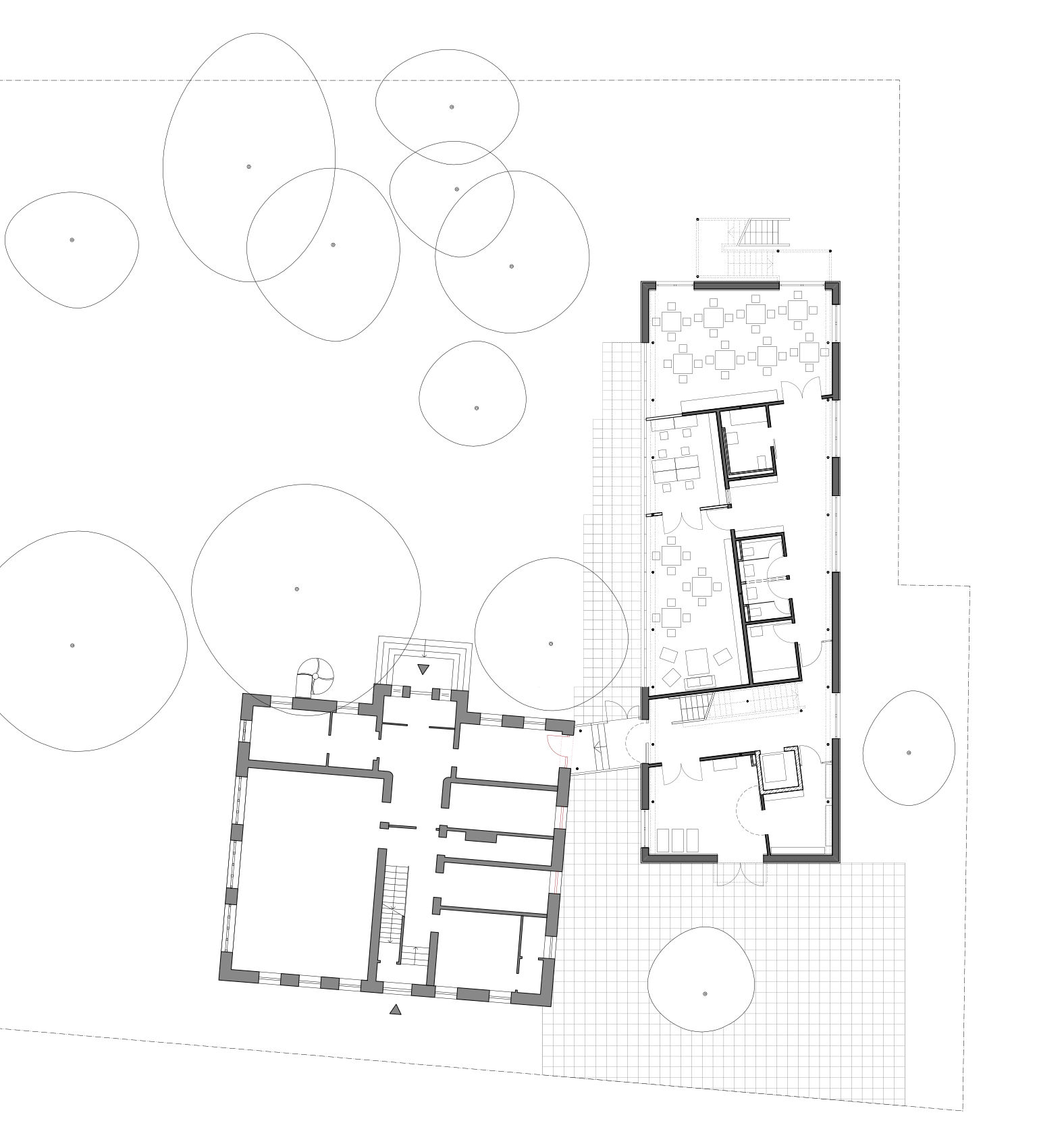 Der Neubau ist östlich des denkmalgeschützen Bestandsgebäudes situiert. Dadurch konnte der bestehende Garten mit Baumbestand sehr gut in die Planung integriert werden.