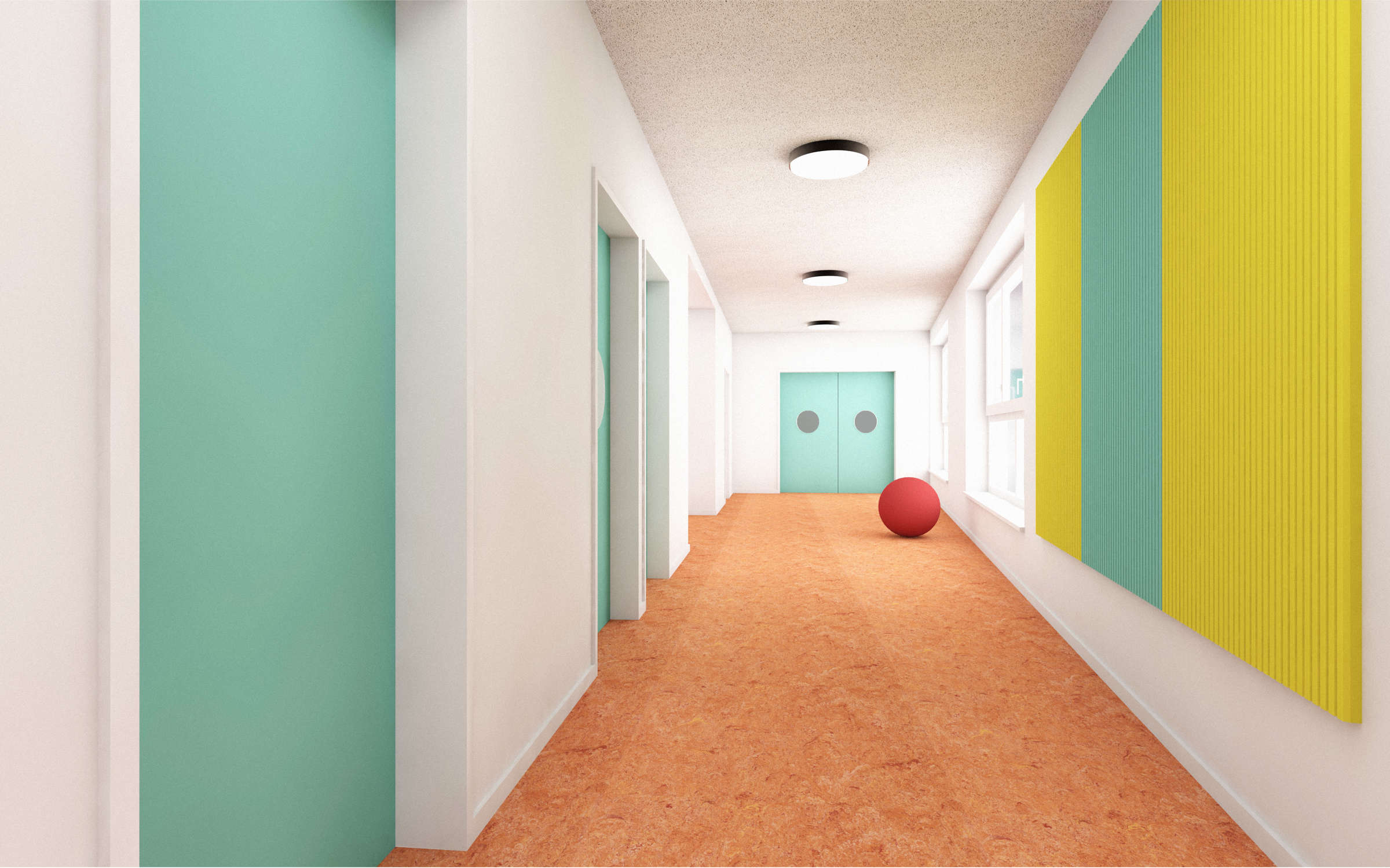 Das flach geneigte Satteldach mit vierseitig umlaufenden Dachüberständen ist für Höhenkirchen-Siegertsbrunn typisch. Der Balkon im Bereich der Kinderkrippengruppe im 1.OG ist am Vordach abgehängt. Der Neubau orientiert sich an der Farbigkeit des denkmalgeschützten Bestandsgebäudes. Die weissen Gesimse, Fenster und Fensterfaschen des historischen Gebäudes übernimmt der Neubau sinngemäß beim Stahlbau, dem Balkon, den Fenstern und dem Sonnenschutz. Durch die Anwendung dieses Gestaltungsprinzips beim Neubau stellt sich eine Ensemblewirkung mit dem historischen Gebäude ein.