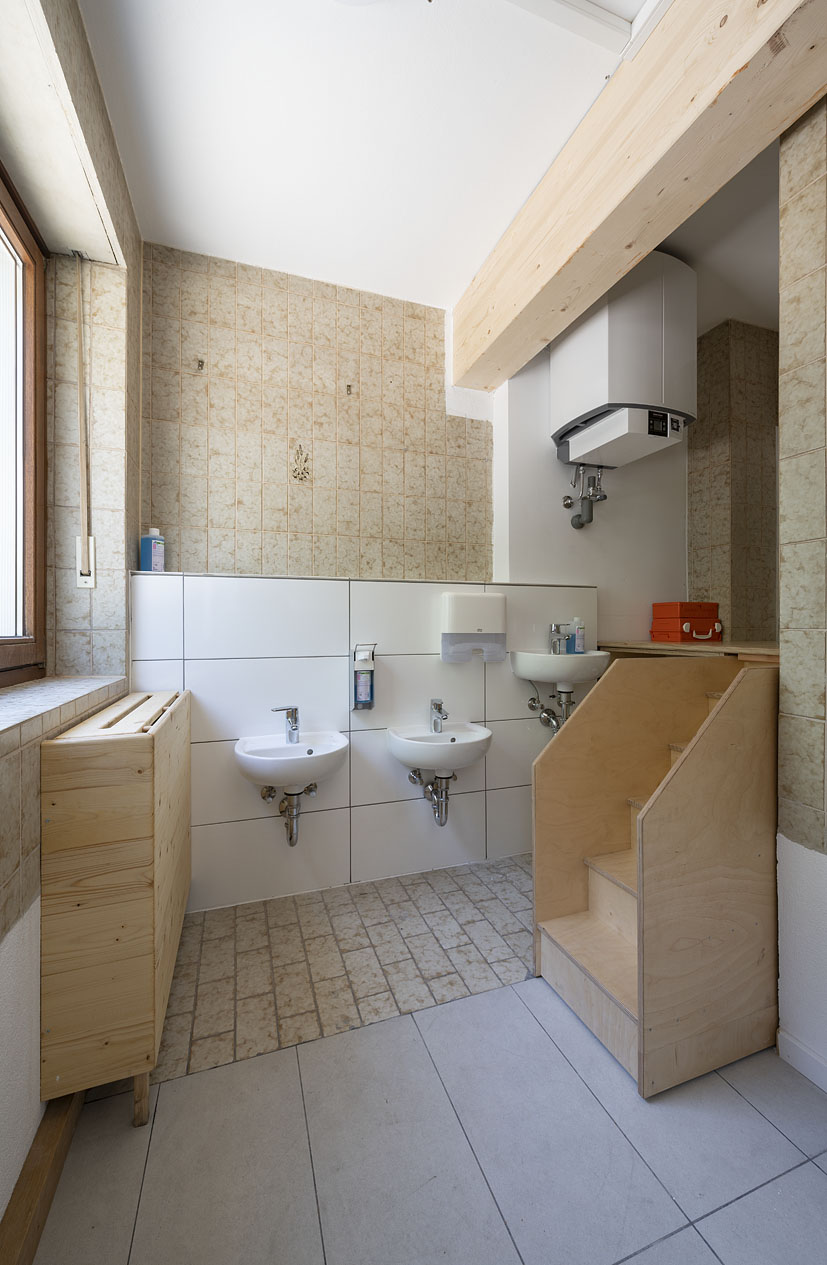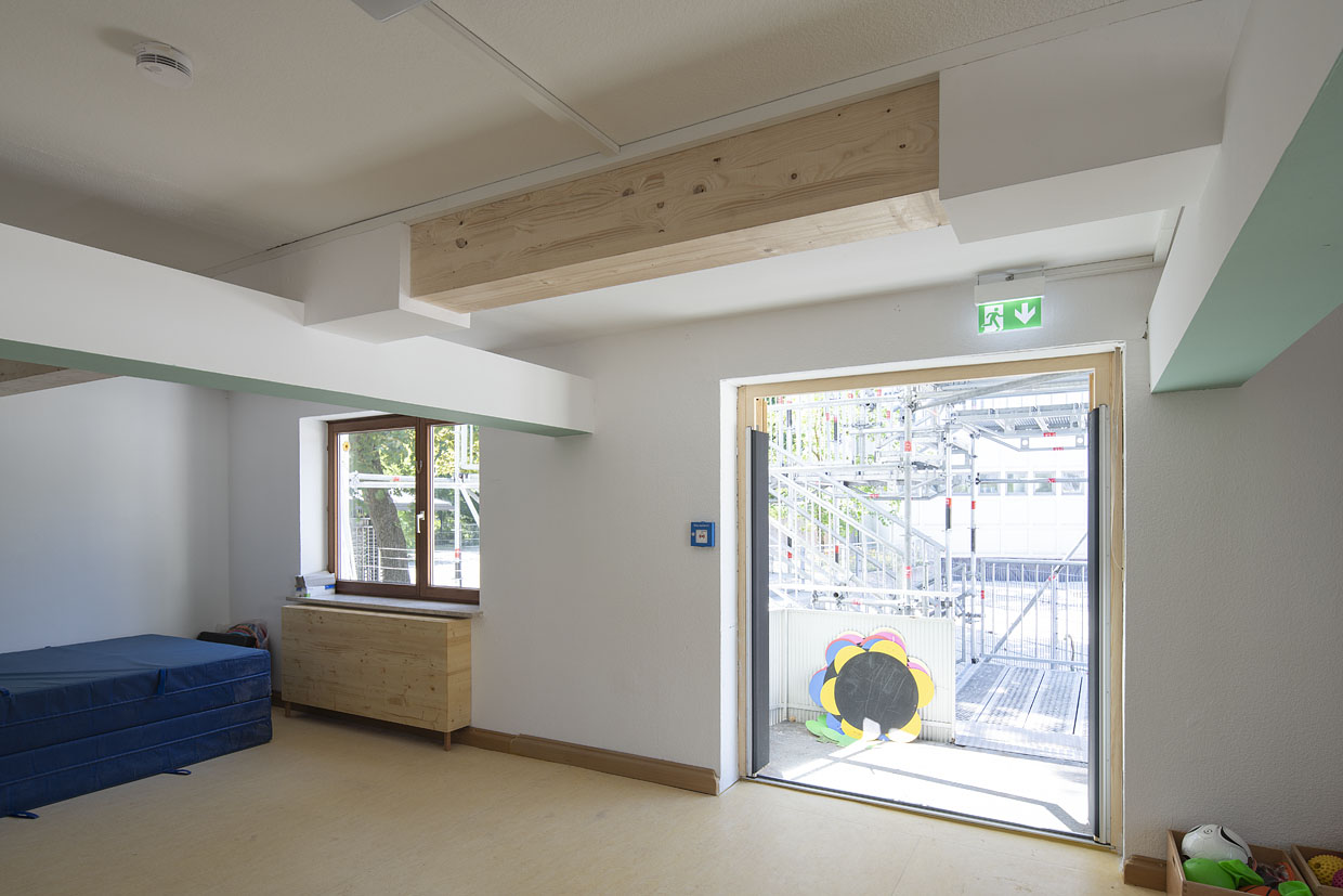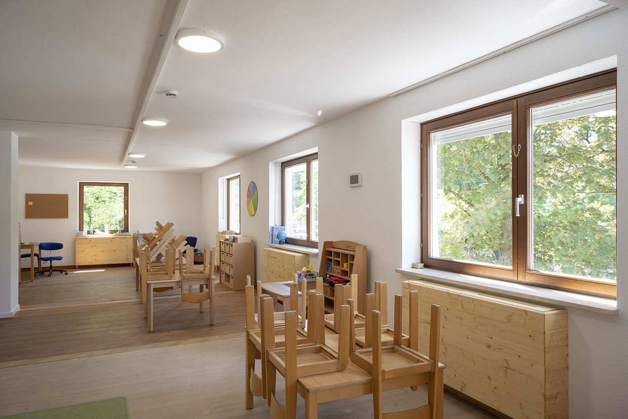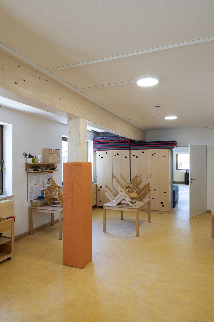 Schnell und als Übergangslösung sollte das Betriebswohngebäude kurzerhand zur KITA-Einrichtung umgewandelt werden. Das erforderte kreative Maßnahmen, die Sicherheitsvorschriften mussten genauso wie für Dauerlösungen eingehalten werden. In einem wahren Sprint konnten wir die Termine und auch die Kosten halten. Die Idee der „Unperfektion“ hat uns hierbei sehr geholfen. Das Ergebnis war überraschend positiv. Fast könnte man sagen: „Jedem Pragmatismus wohnt ein Zauber inne“.