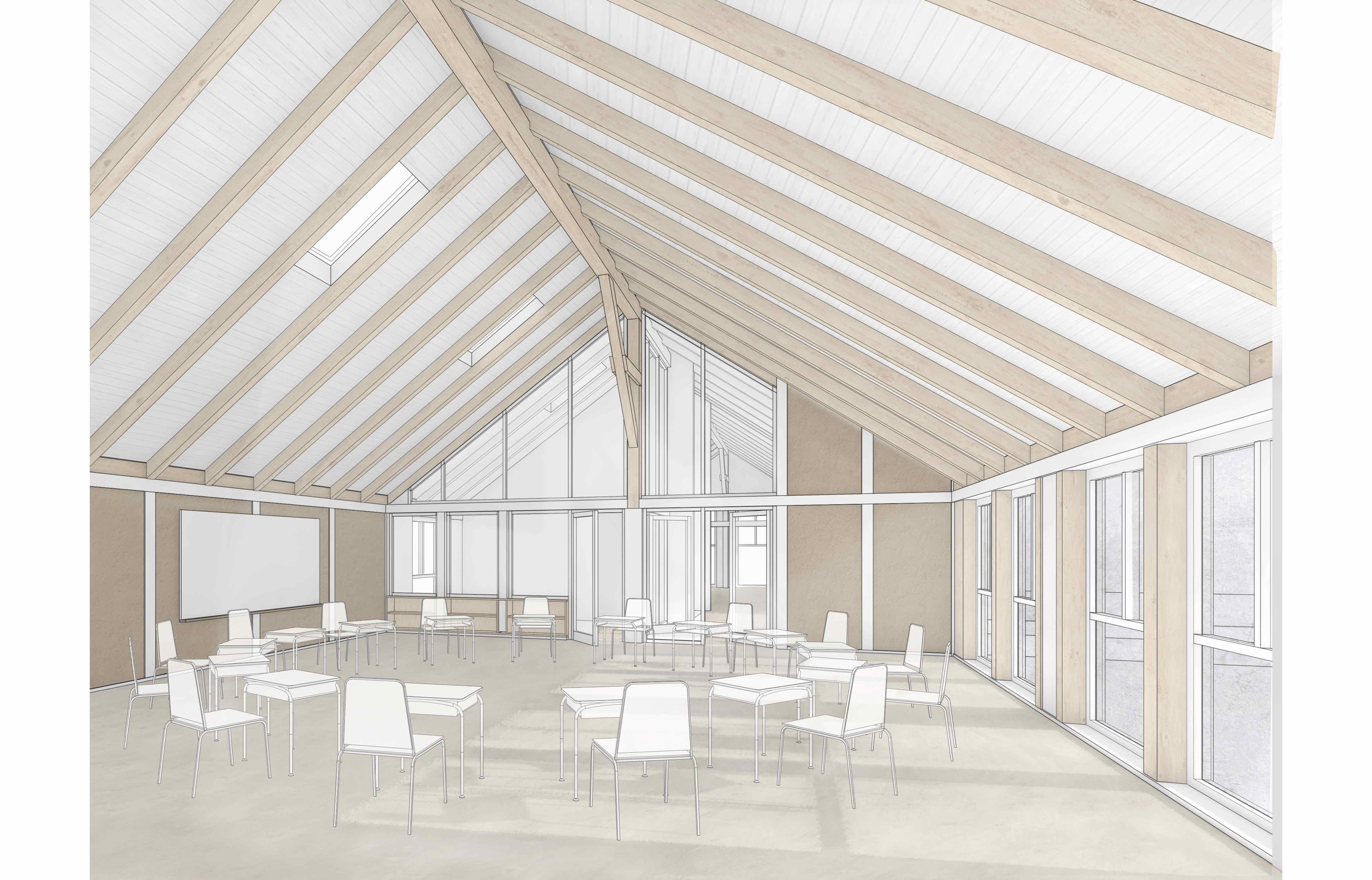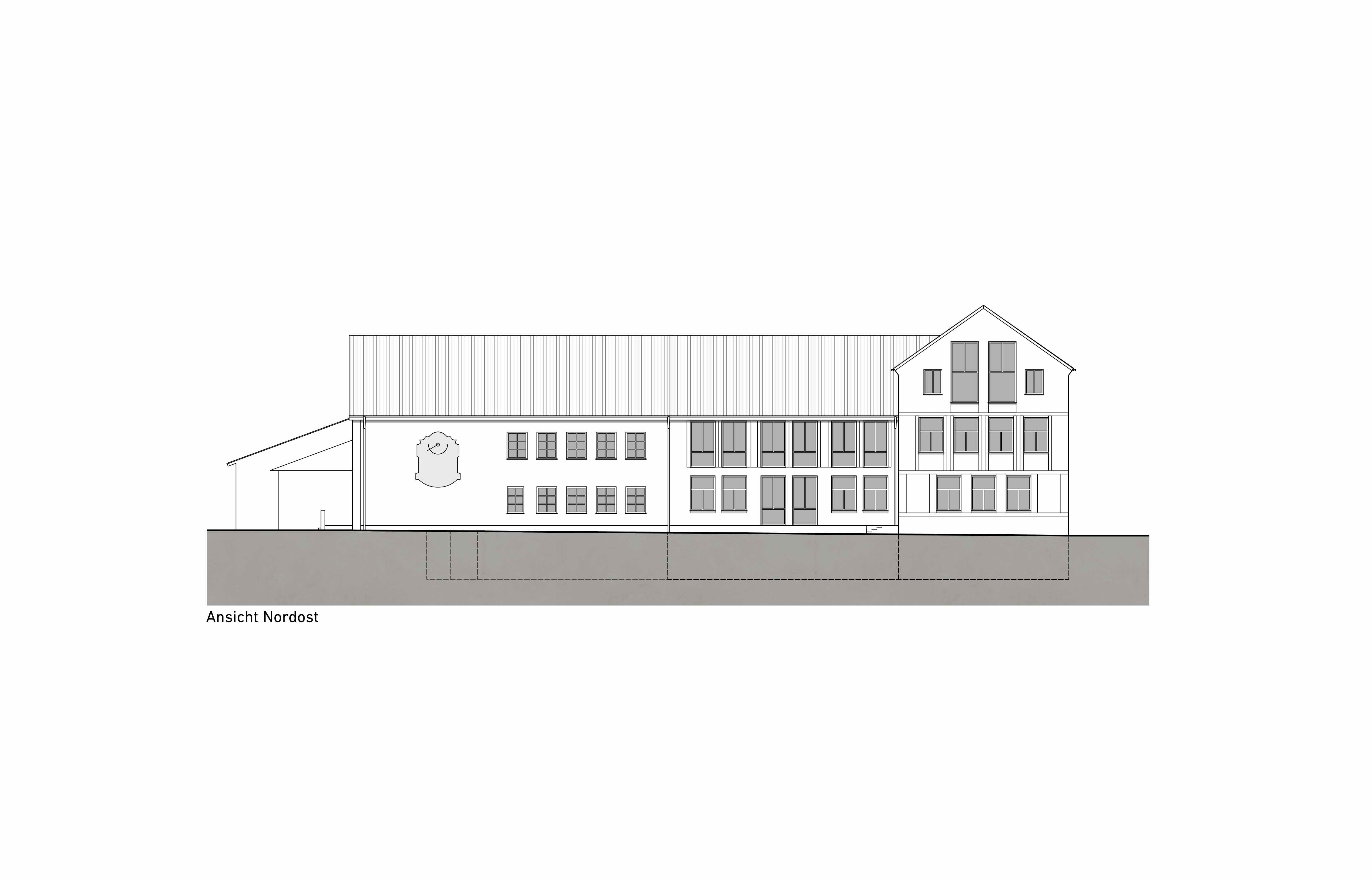 Der Verwaltungsbereich im Nordosten des Erdgeschosses kann über einen separaten Eingang erschlossen werden, die Anordnung der Mittagsbetreuung ermöglicht eine optimale Anbindung und Nutzung der Aussenflächen. Der Lehrerbereich/Bibliothek erhält eine Arbeits- und Lesegalerie, dem Musik- bzw. Mehrzweckraum wird das Volumen des Daches hinzugefügt und dadurch die akustischen Eigenschaften des Raumes verbessert.