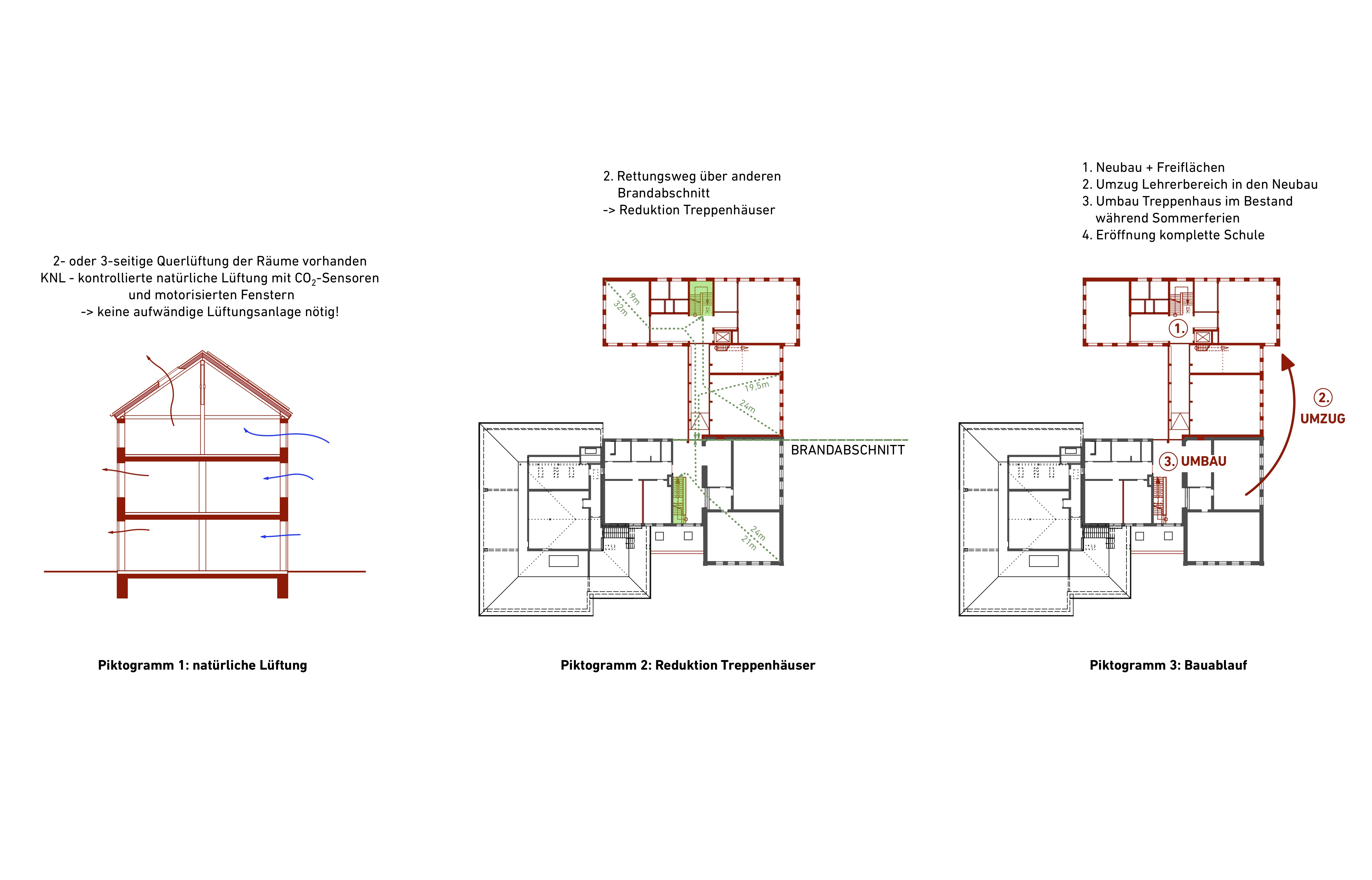 Alle neuen Klassenräume werden zweiseitig belichtet und belüftet. Zusätzlich zur optimalen Belichtung kann hierdurch auch auf aufwendige Lüftungsanlagen verzichtet werden, da in allen Klassenräumen eine Querlüftung möglich ist – siehe Piktogramm 1.