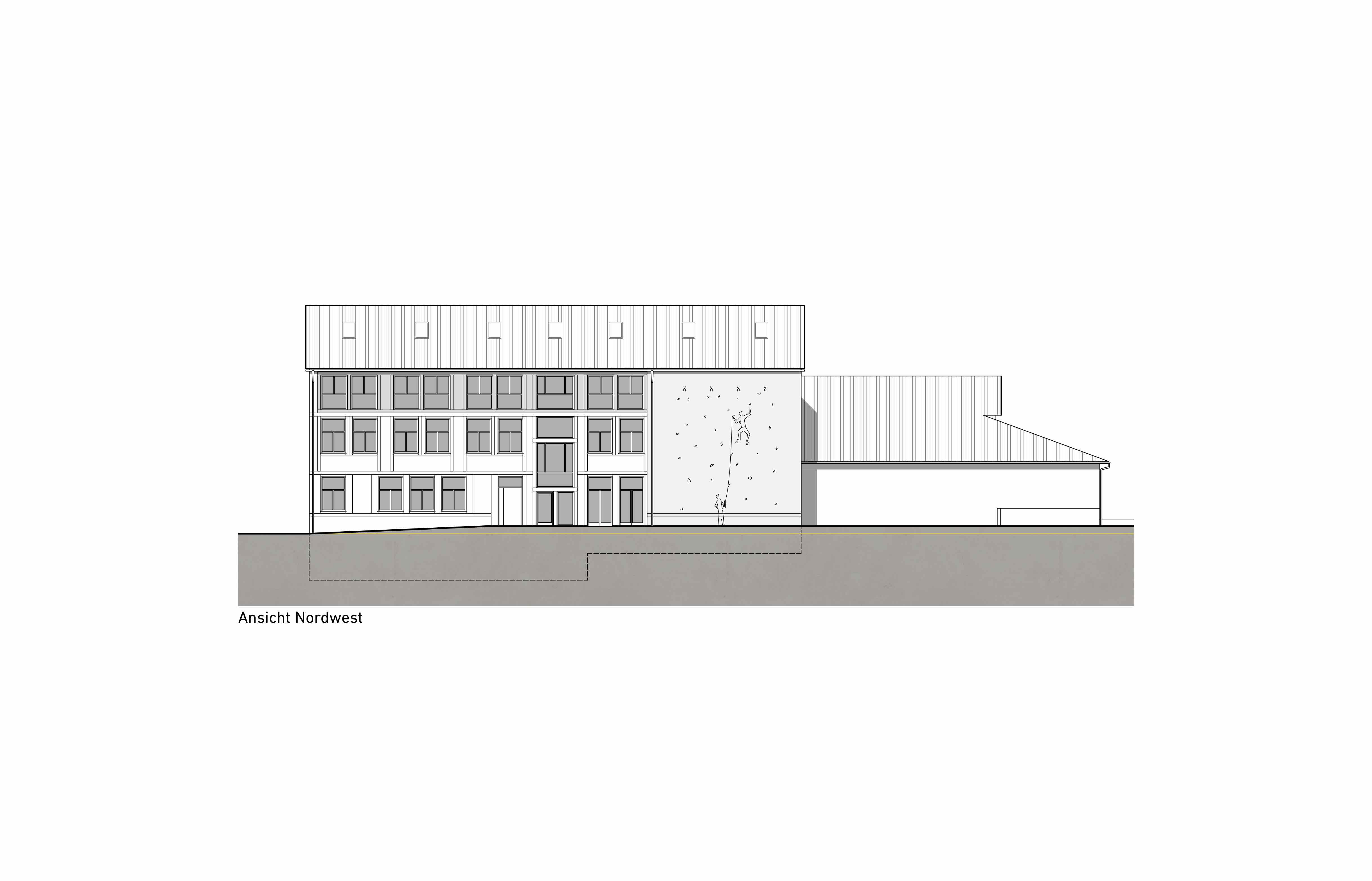 Entlang der Aussenwand der bestehenden Sporthalle befindet sich der Geräteschuppen. Dieser wird gestalterisch und funktional in das Kletterhaus mit Rampe, Leitern und Netz integriert.