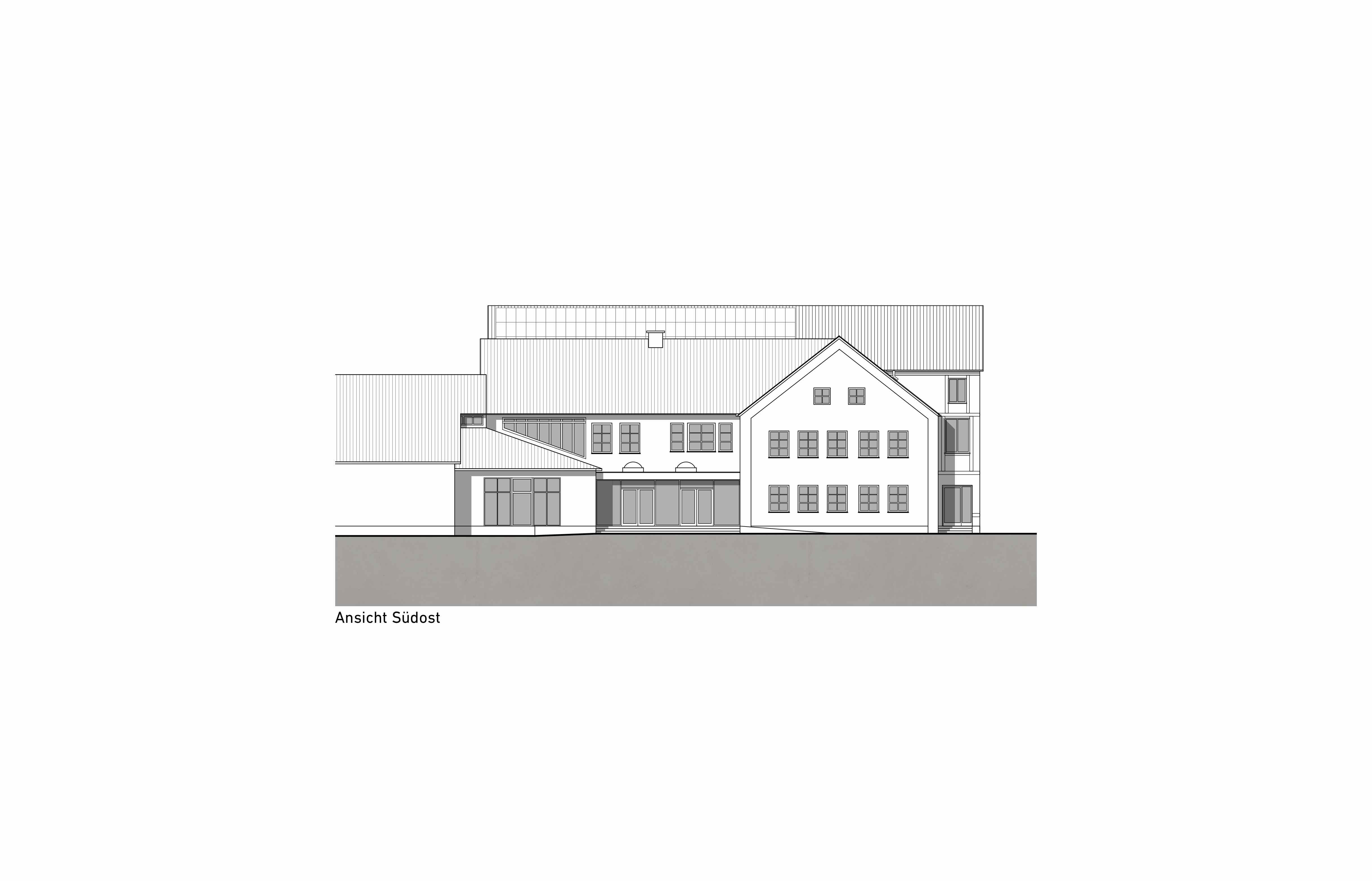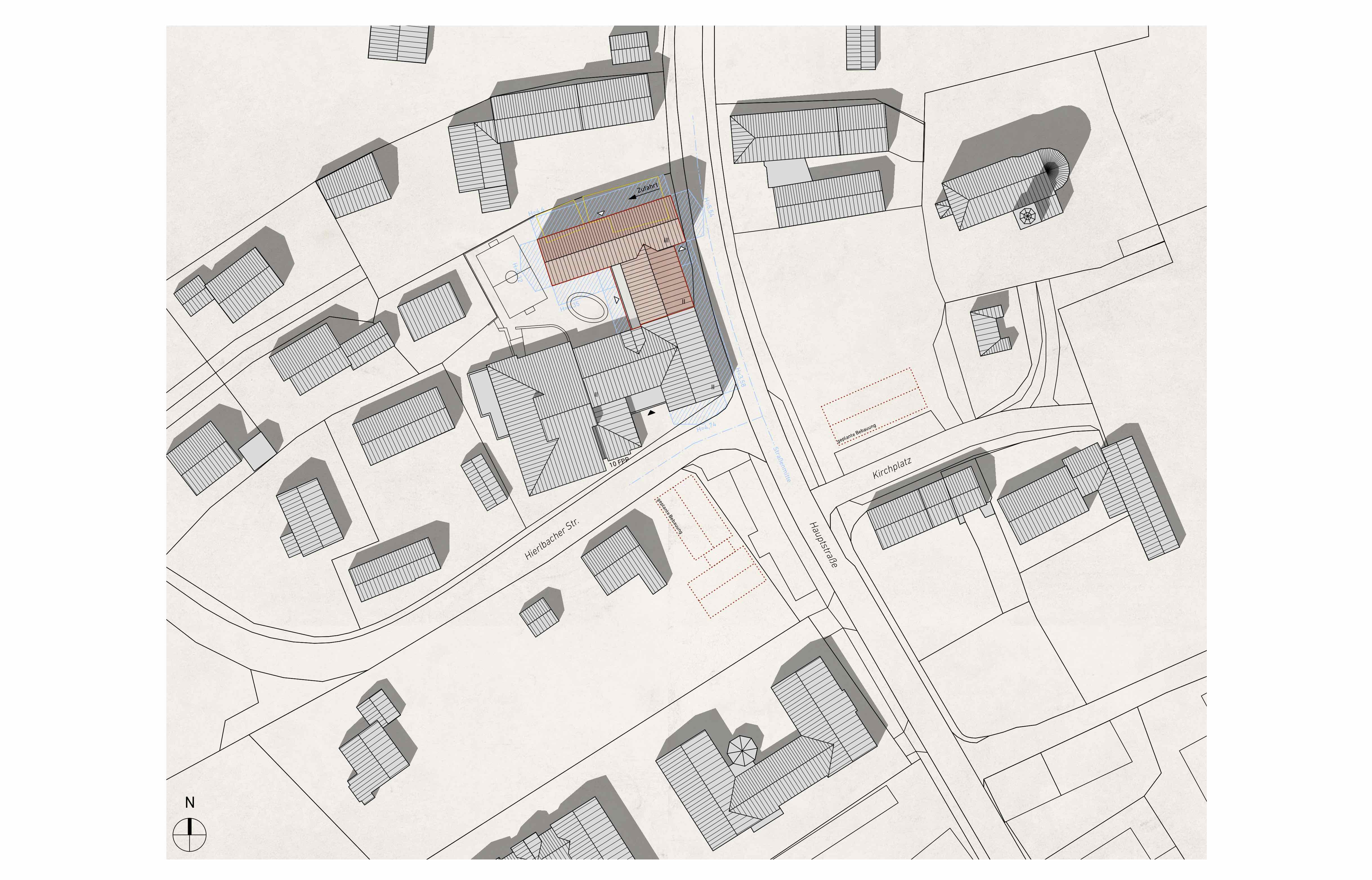 Der Neubau setzt städtebaulich die bestehende Bebauung entlang der Hauptstraße fort und nimmt die Trauf- und Firsthöhe des Bestandsgebäudes auf.