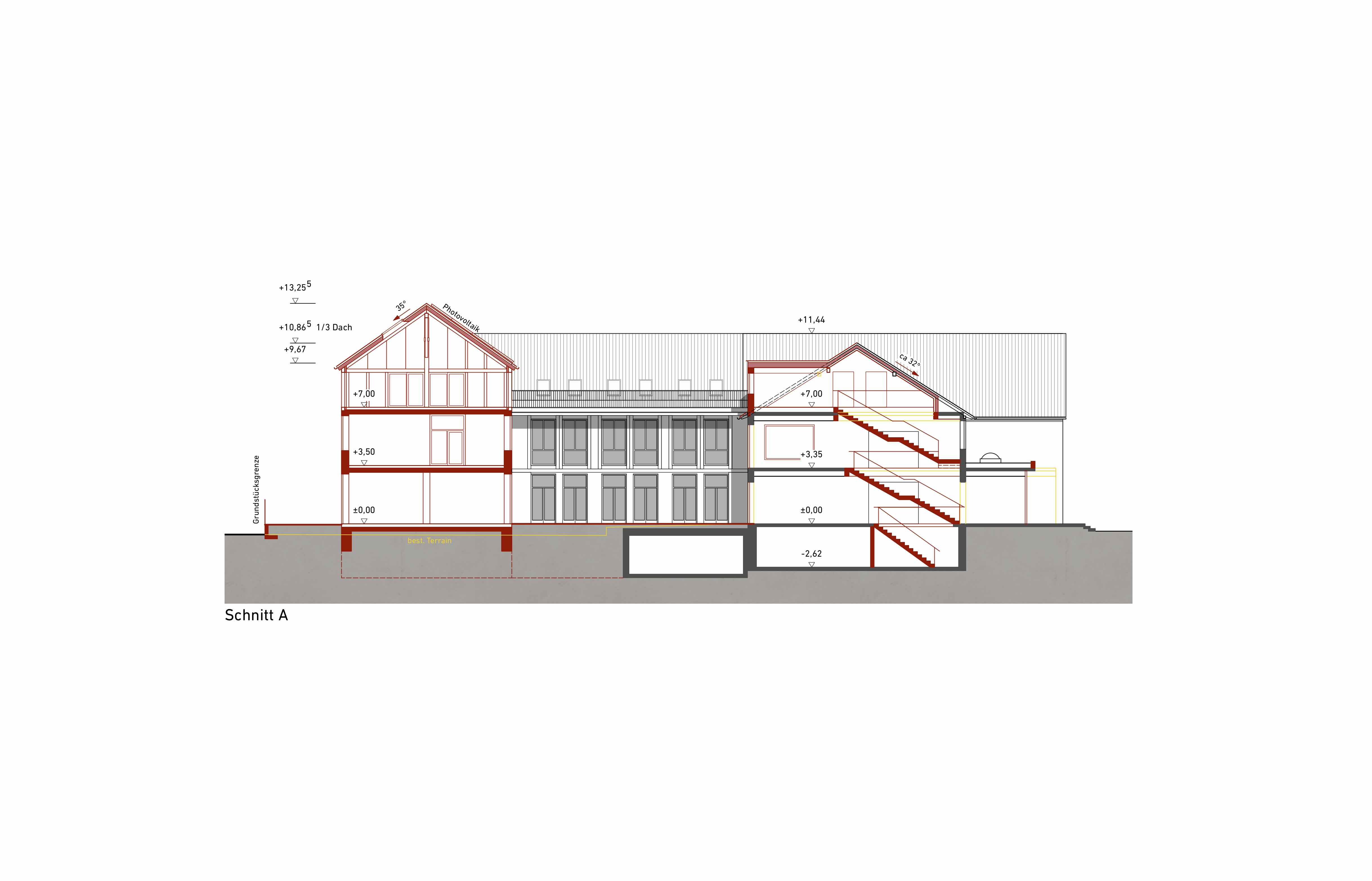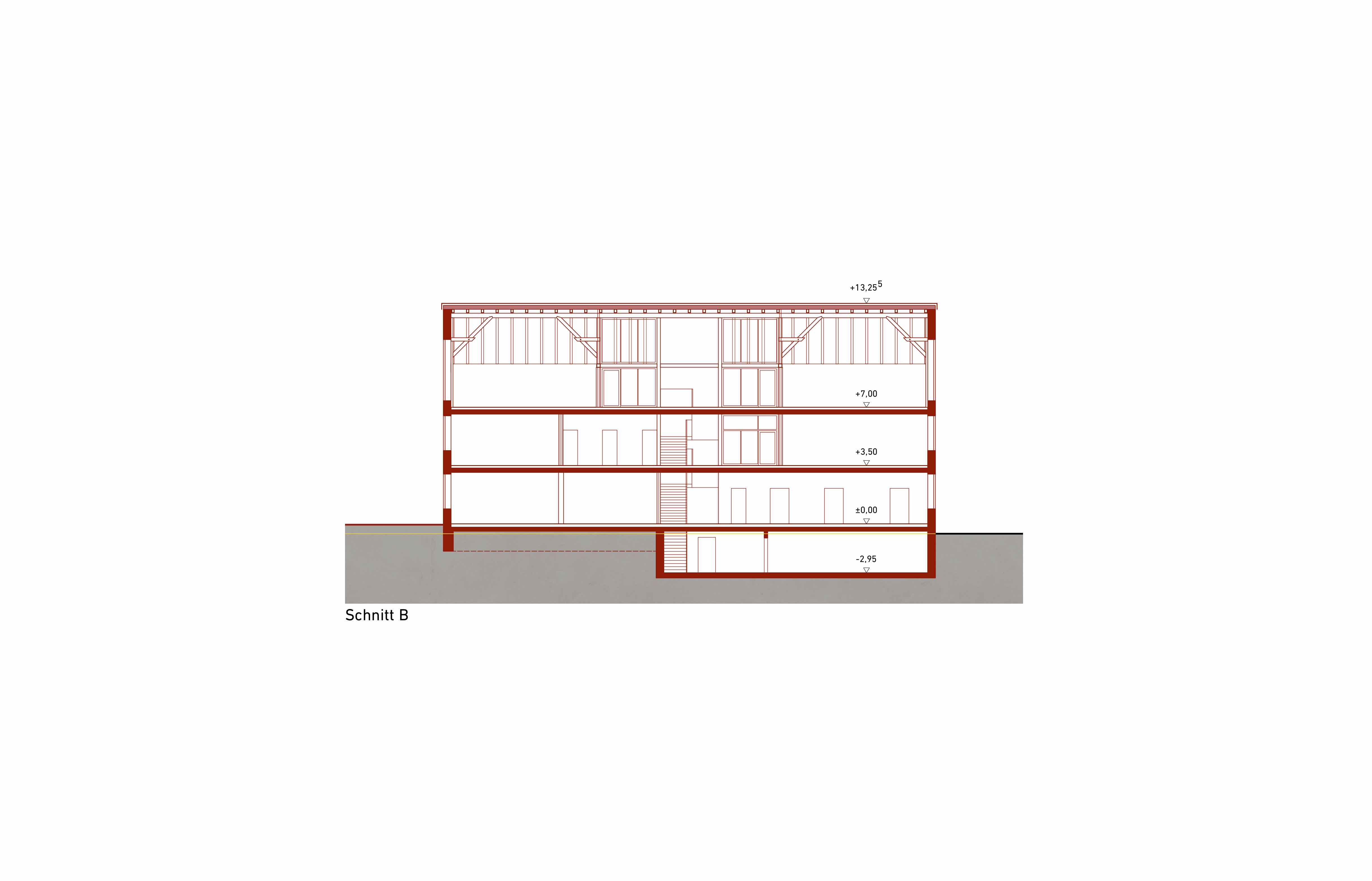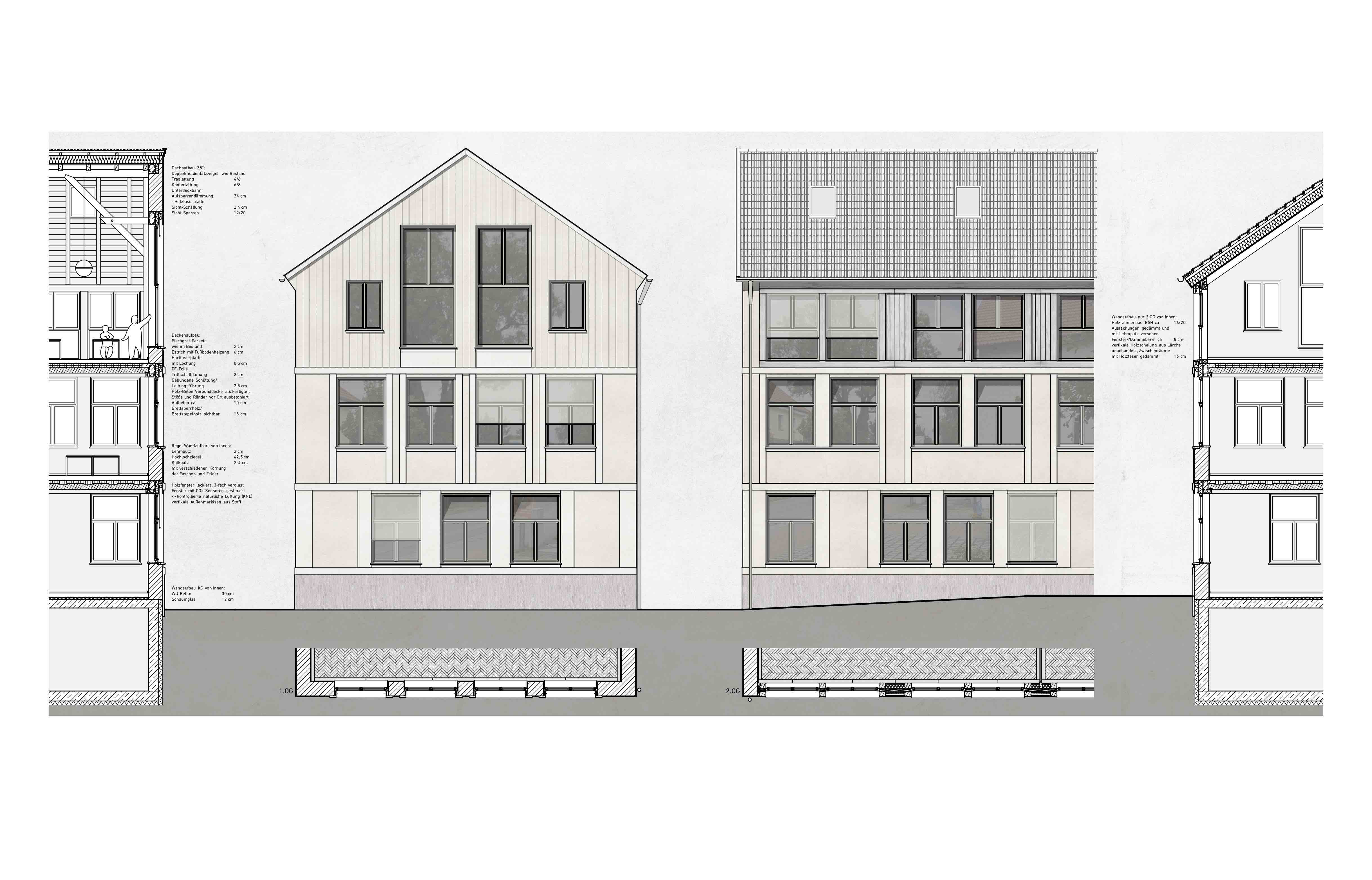 Der Neubau nimmt die Materialität und Konstruktion der Bestandsgebäude auf. Die Aussenwände werden aus Hochlochziegeln gemauert und beidseitig verputz. Die Decken bestehen aus Holzbeton-Verbund Elementen, die eine schnellere Montage ermöglichen. Das Dachgeschoss mit sichtbarem Dachstuhl wird komplett im Holz ausgeführt, außer Giebelwände. Die gesunden Materialien, das Reduzieren des Betons und ein Verzicht auf WDVS sind unsere Argumente für ein nachhaltiges Gebäude.