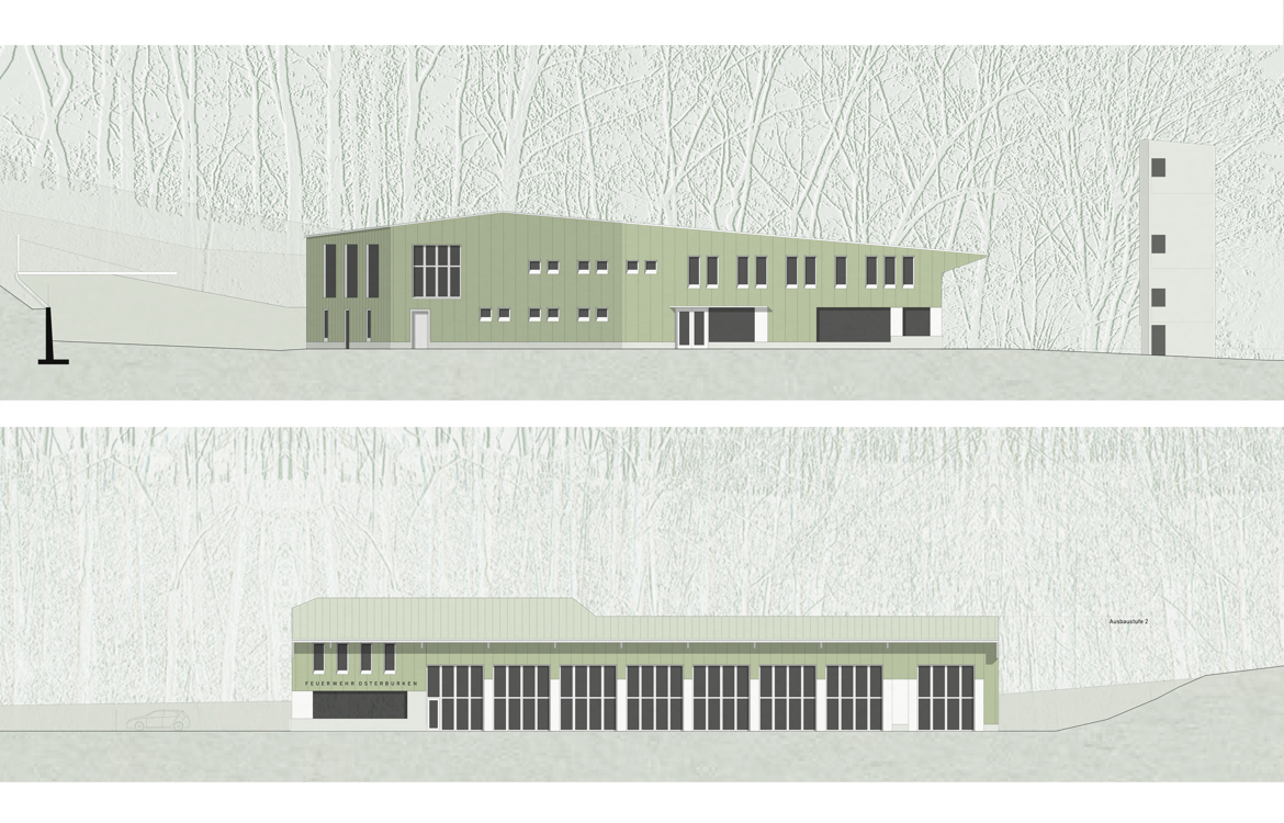 Die Fahrzeughalle wird in der Ausbaustufe 2 um zwei Stellplätze im nordwestlichen Teil des Grundstücks erweitert. In diesem Bereich wird das Gelände an den Erweiterungsbau angeschlossen. Die Übungsfläche wird dadurch nicht verkleinert.