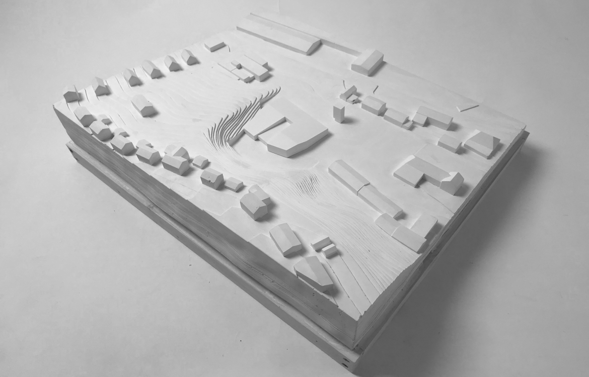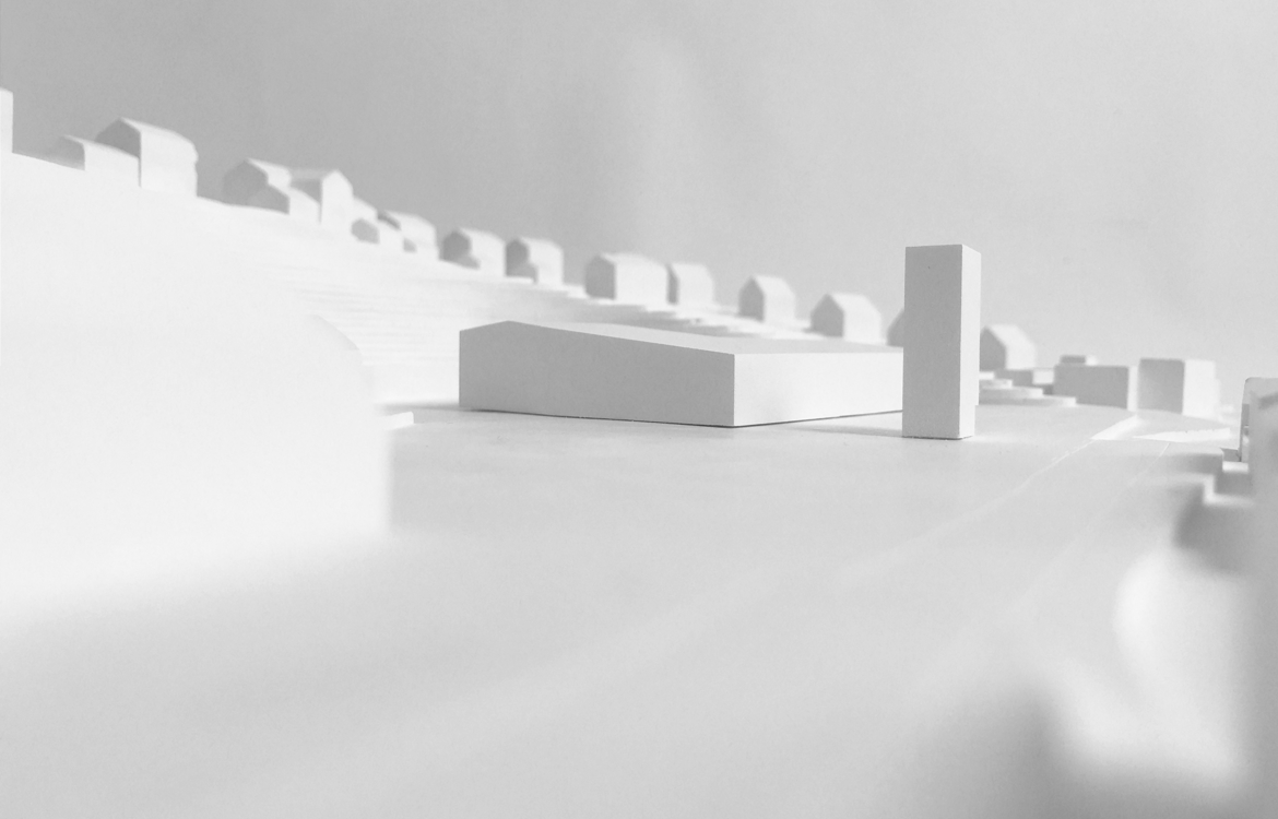 Das Feuerwehrhaus vermittelt topographisch und städtebaulich zwischen dem nordwestlich angrenzenden Gewerbegebiet und dem Wohngebiet im Südosten. Die Organisation der Funktionsbereiche unterschiedlicher Raumhöhen unter „einem Dach“ führt zu einer bewegten Dachform, die die vorhandene Topographie aufnimmt und räumlich fortführt. Auf diese Weise entsteht ein städtebauliches „Paßstück“, dass trotz seiner funktionalen Organisation, eine auf den Ort zugeschnittene architektonische Ausformung erhält.Das Feuerwehrhaus nimmt die Richtung der benachbarten Gebäude auf und schafft dadurch einen günstigeren Alarmausfahrtswinkel zur Hagerstraße. Die Dachterrasse bietet der Feuerwehr einen geschützten Aussen- bereich, der vorgelagerte Übungsturm bildet einen städtebaulichen Hochpunkt und fungiert als Landmark.