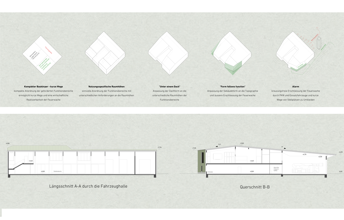 Die kompakte Organisation des Feuerwehrhauses ermöglicht kurze Wege und eine wirtschaftliche Realisierbarkeit des Gebäudes. Durch diese kompakte Anordnung können zudem die Erdbauarbeiten am Gelände, speziell im Hangbereich, auf ein notwendiges Minimum reduziert werden.