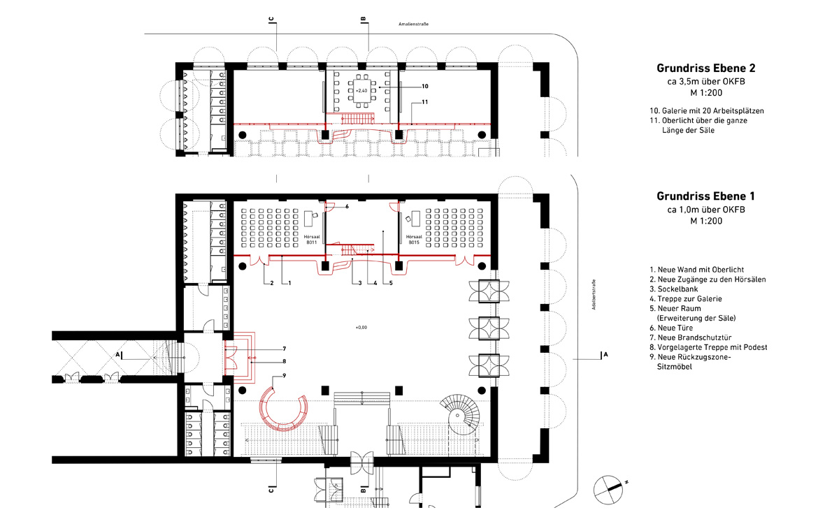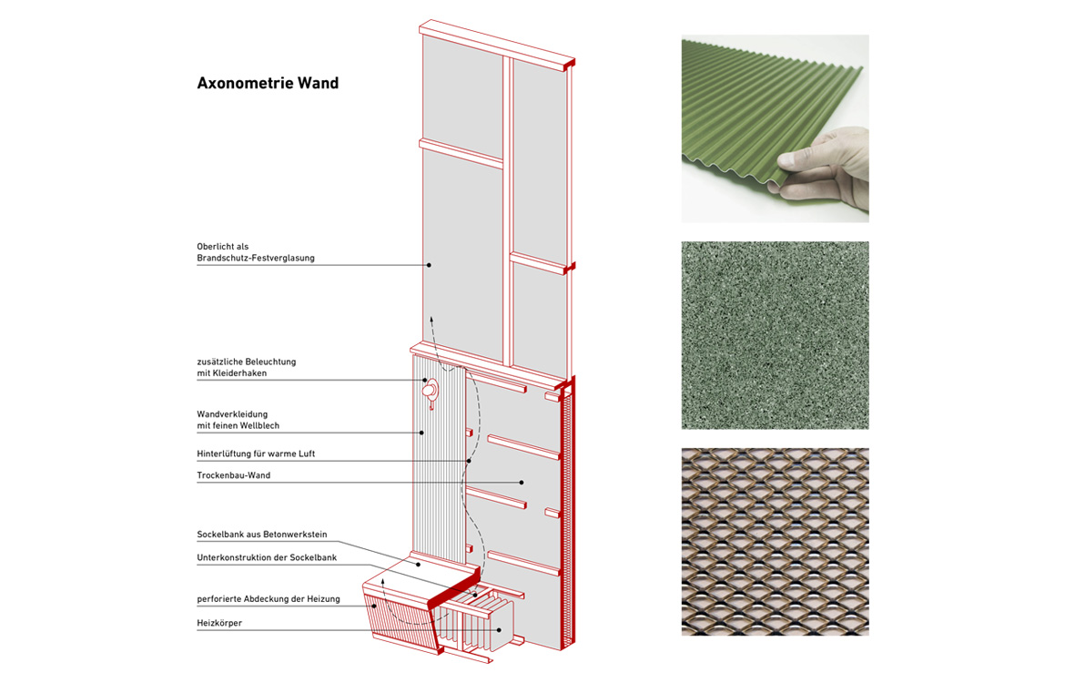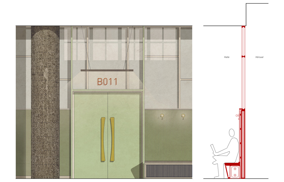 Unser Entwurf basiert auf der Gestaltung einer Wand mit Sitzfläche, Oberlicht, integrierter Heizung und zusätzlicher, punktueller Beleuchtung unter Berücksichtigung des Brandschutzes eines notwendigen Flures. Die Eingänge zu den Hörsälen werden vergrössert und neu gestaltet.