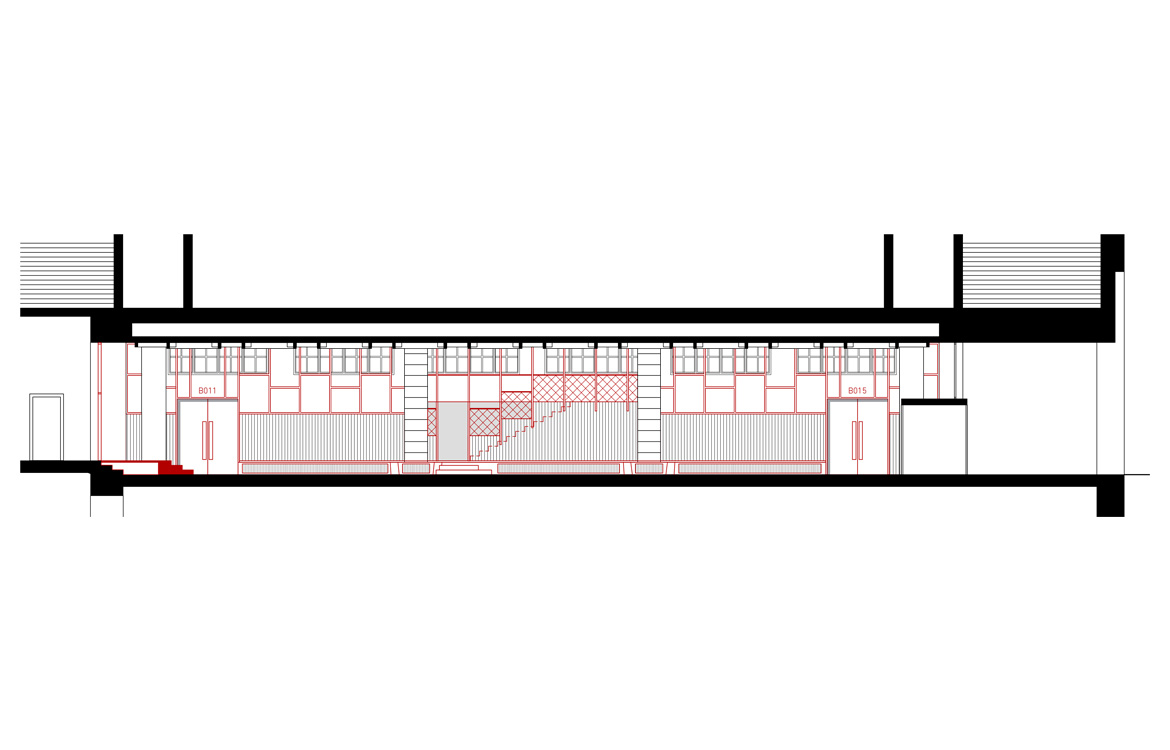 Unser Konzept sieht eine Sockelbank entlang der Trennwände zu den Hörsälen B011 und B015 vor. Die Hörsäle wurden nachträglich eingebaut, ihre Ausführung entspricht nicht der architektonischen Qualität der anderen Bauteile der Adalberthalle. Die Wände weisen kaum mehr Qualitäten als die der reinen Raumtrennung auf. Zudem wurde der Adalberthalle auch das Tageslicht genommen.