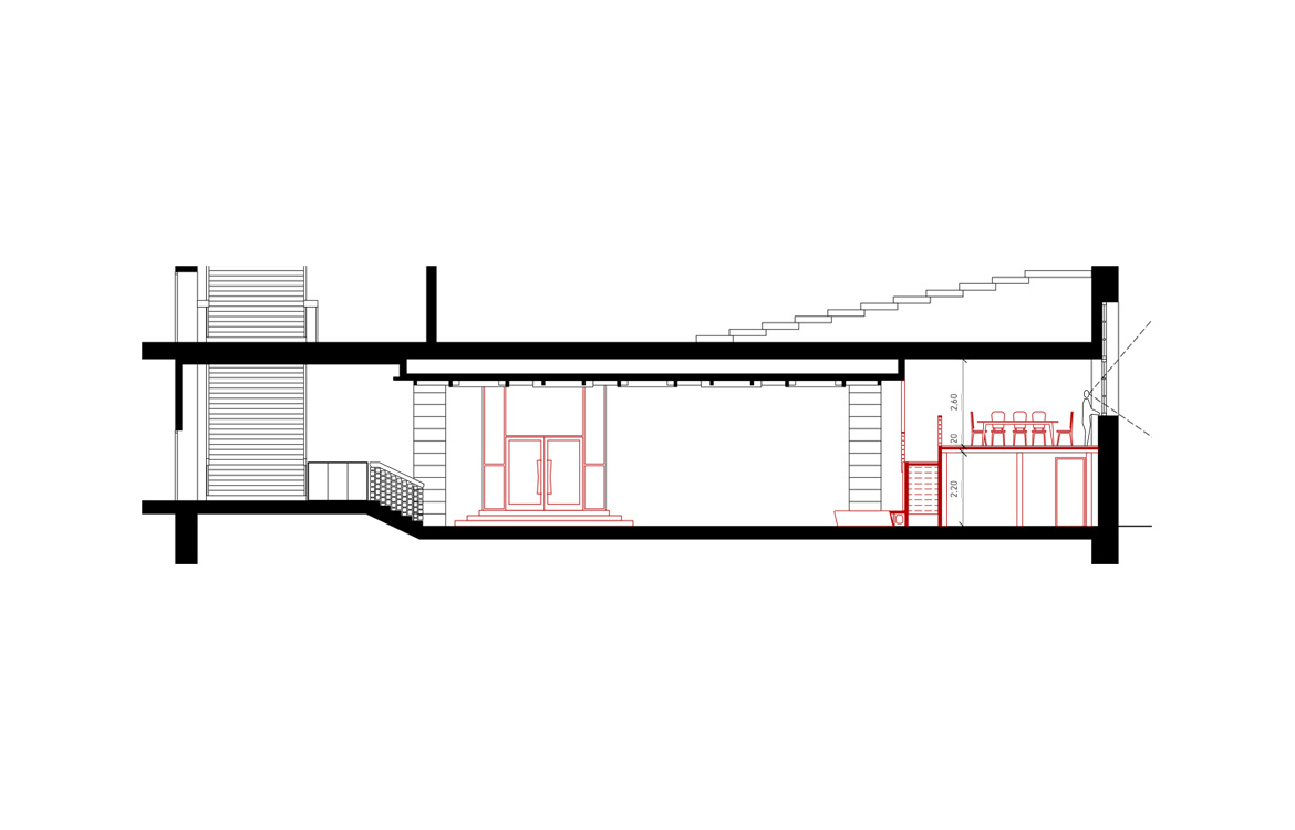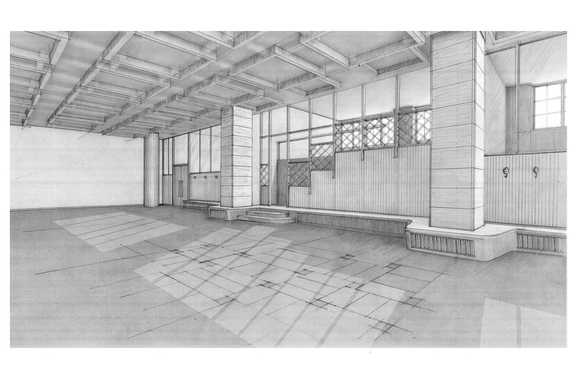 Der Transit- und Eingangsraum der Adalberthalle muss seine großzügige Dimension beibehalten, um die Studenten in den Spitzenzeiten weiterhin aufnehmen zu können. Aus diesem Grund verzichten wir auf eine neue räumliche Gliederung des Raumes.