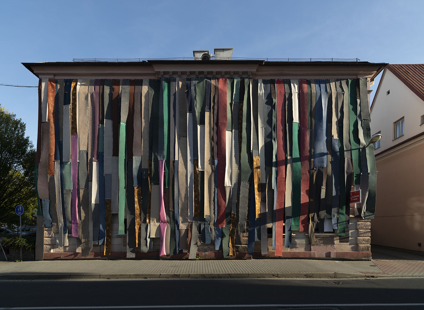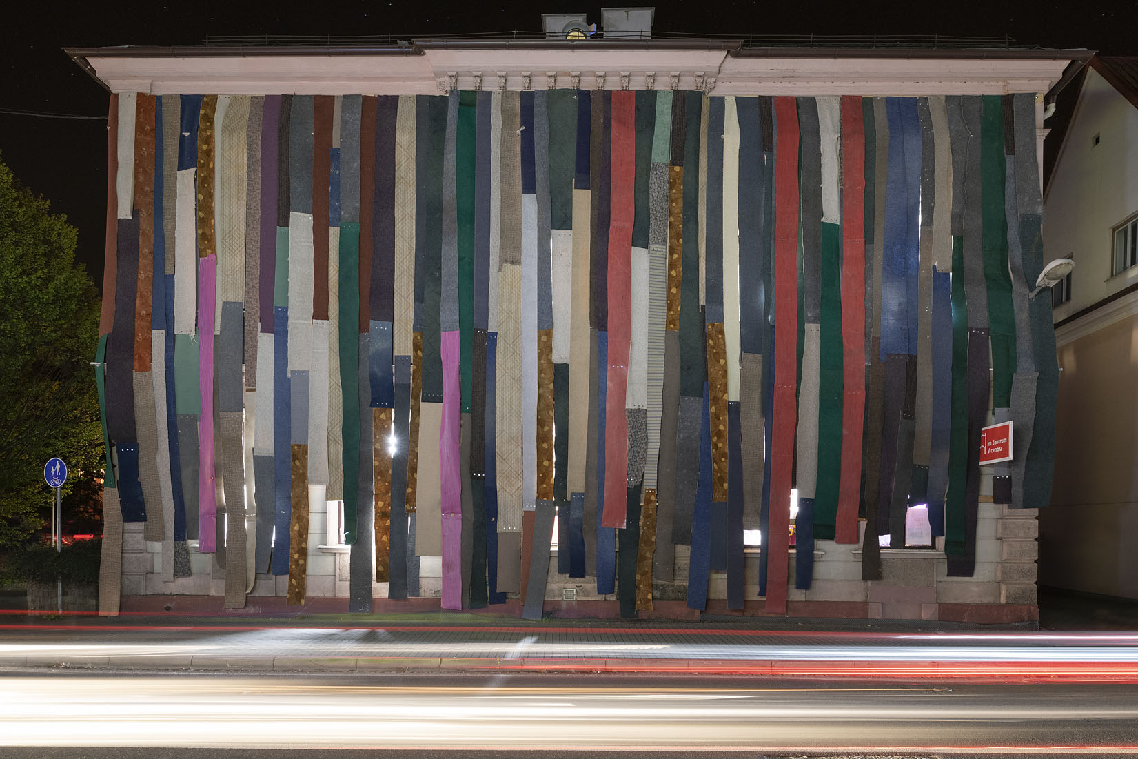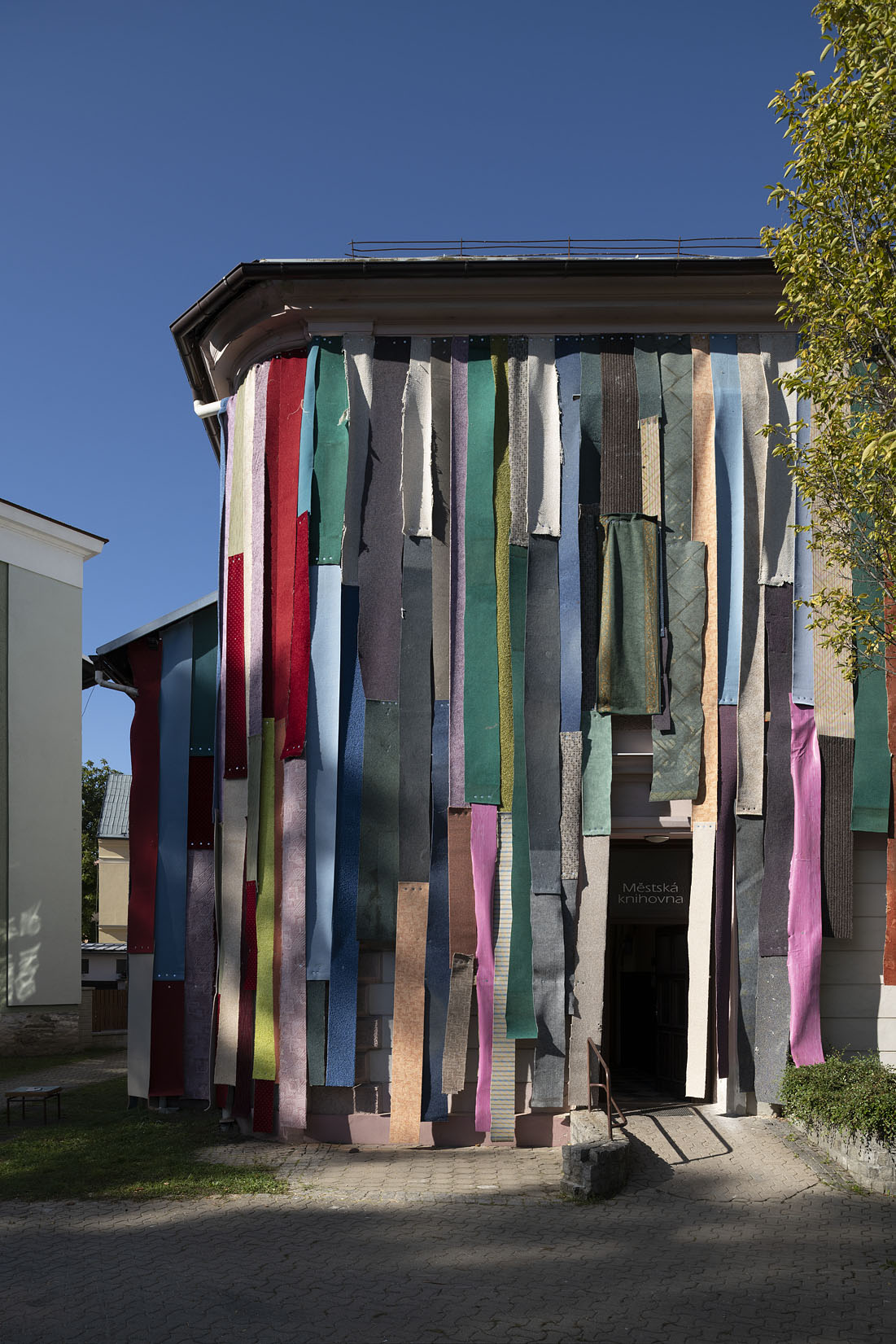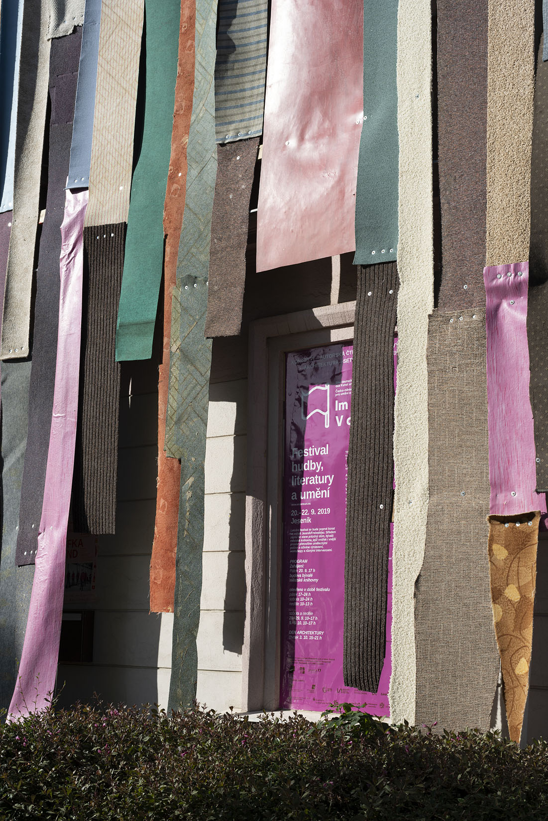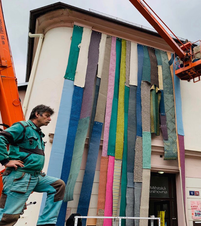 Eigentlich eine Auftragsarbeit: für ein Festival in Tschechien sollte eine alte Bibliothek als Blickfang temporär überarbeitet werden. Eine gesteigerte Aussenwirkung war also Programm. Dass unsere Idee, die Wand mit den entfernten Teppichen aus dem Haus zu verkleiden, zu einem gleich so dekorativen Ergebnis führt, war für uns auch eine Überraschung. Das Ganze entstand im „Do it yourself Verfahren“ und hat einen Riesenspaß gemacht. 1200 Schrauben haben wir in der Hauswand und in den Teppichen versenkt.
