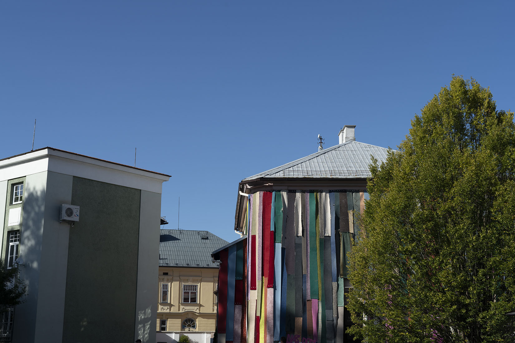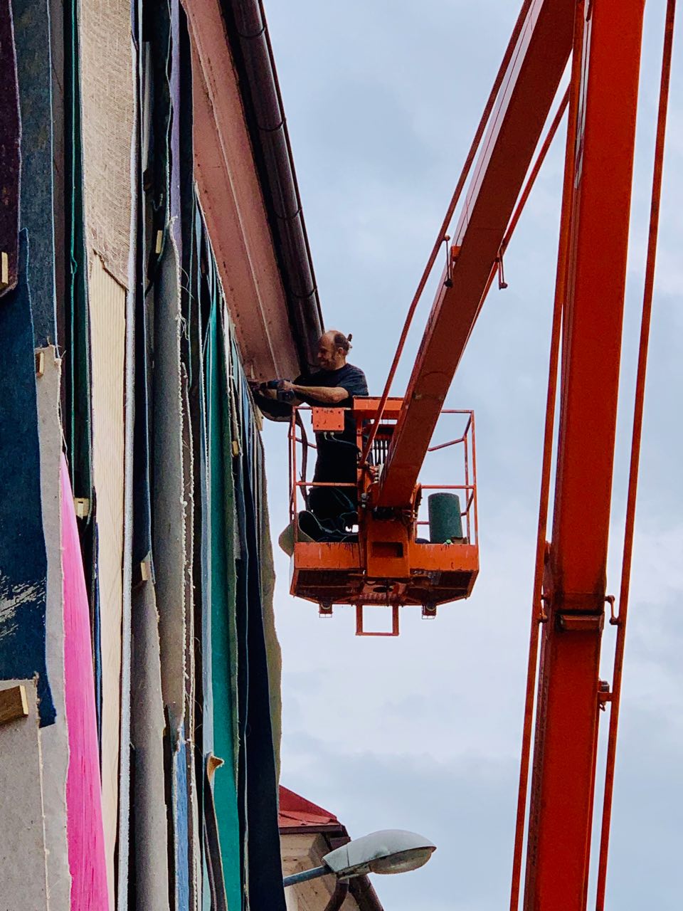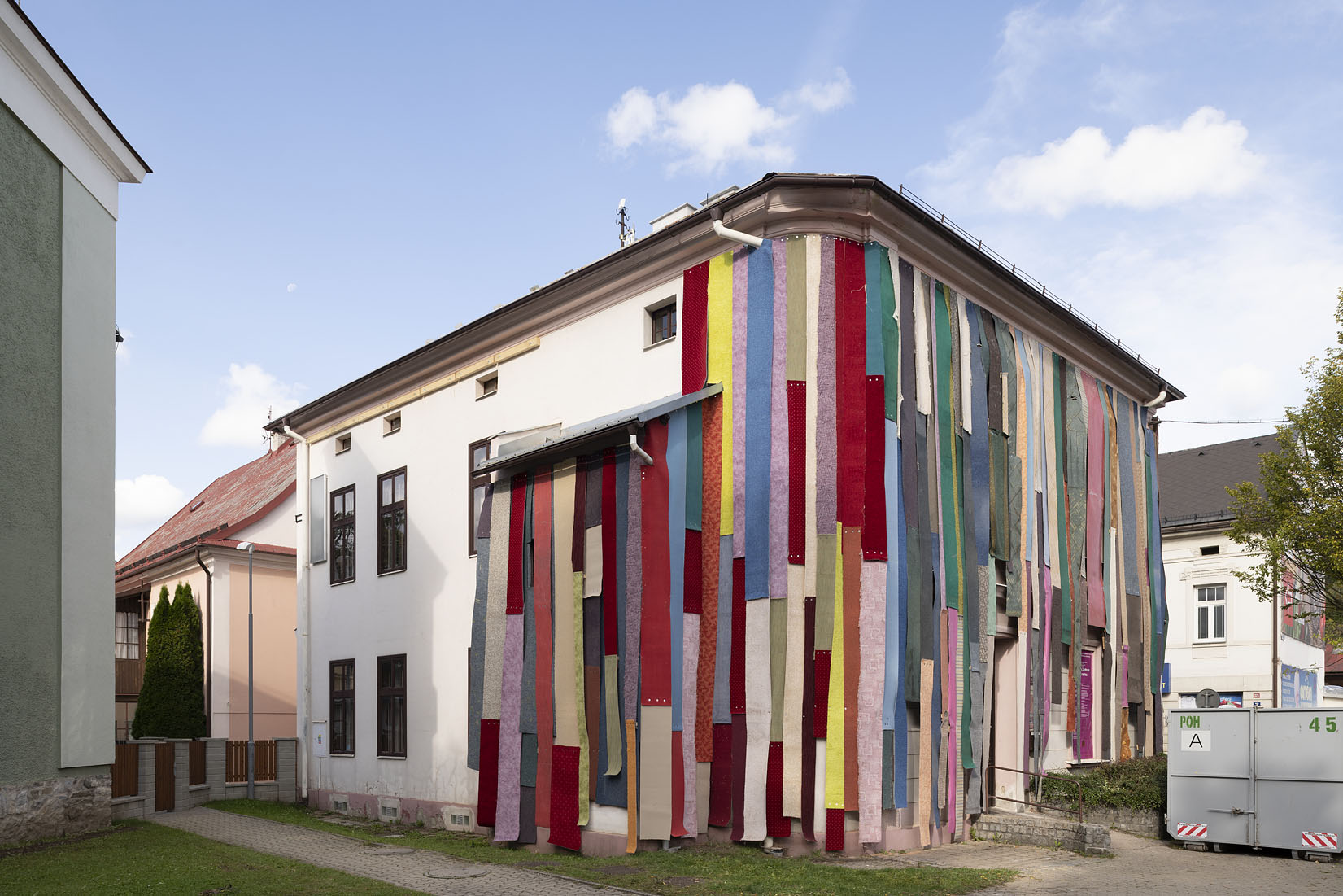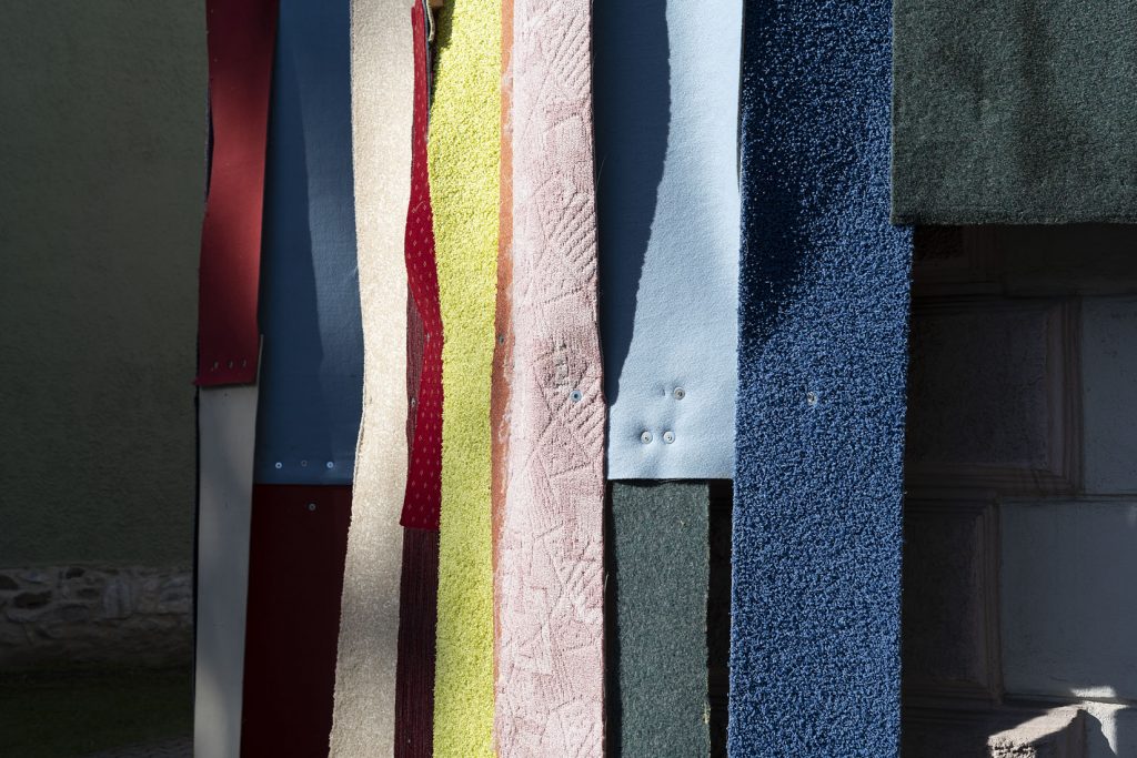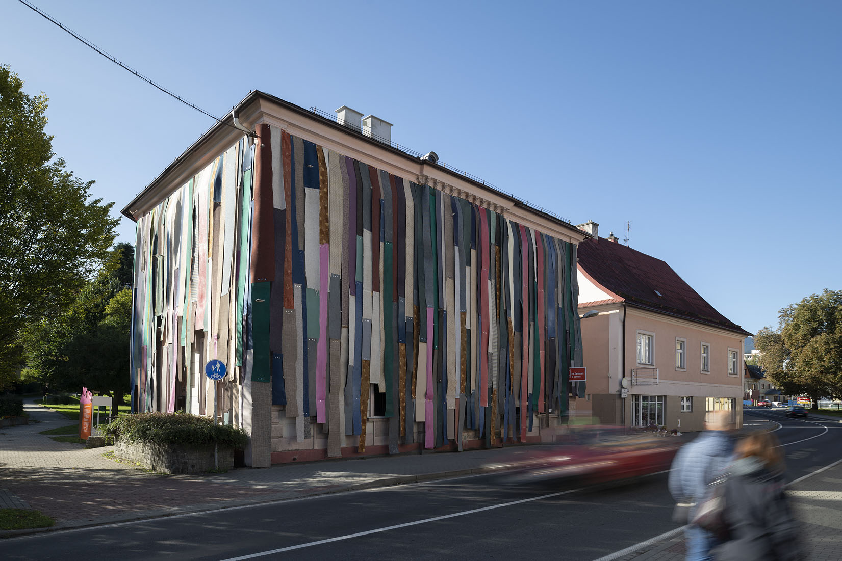 Eigentlich eine Auftragsarbeit: für ein Festival in Tschechien sollte eine alte Bibliothek als Blickfang temporär überarbeitet werden. Eine gesteigerte Aussenwirkung war also Programm. Dass unsere Idee, die Wand mit den entfernten Teppichen aus dem Haus zu verkleiden, zu einem gleich so dekorativen Ergebnis führt, war für uns auch eine Überraschung. Das Ganze entstand im „Do it yourself Verfahren“ und hat einen Riesenspaß gemacht. 1200 Schrauben haben wir in der Hauswand und in den Teppichen versenkt.