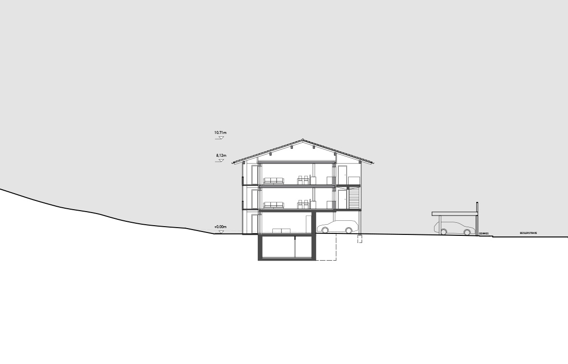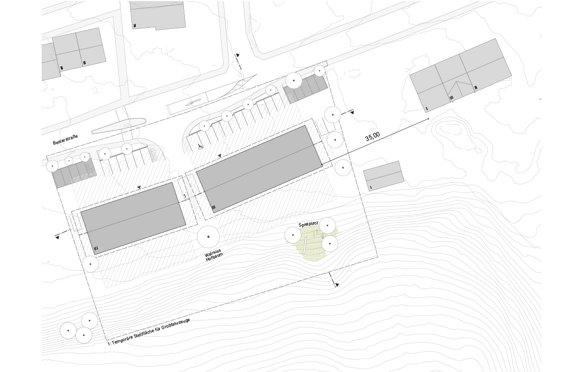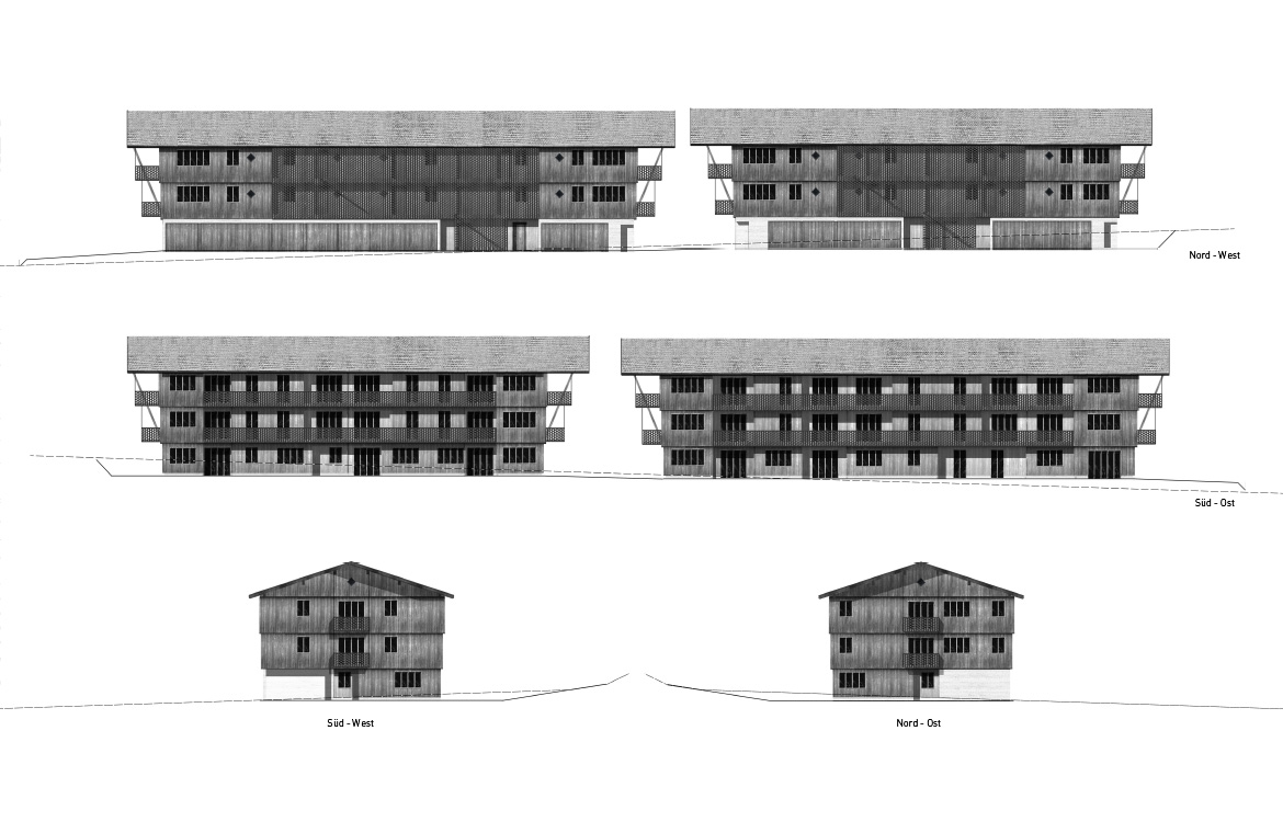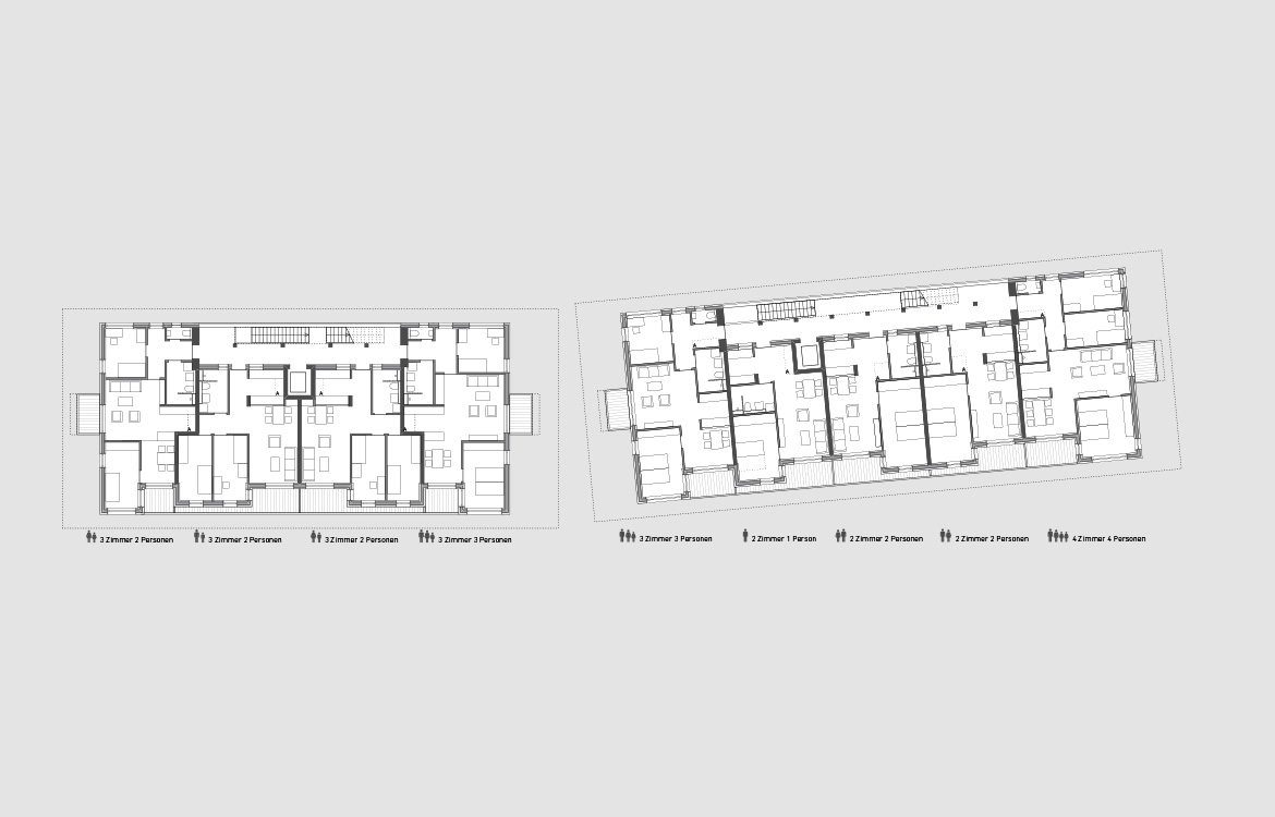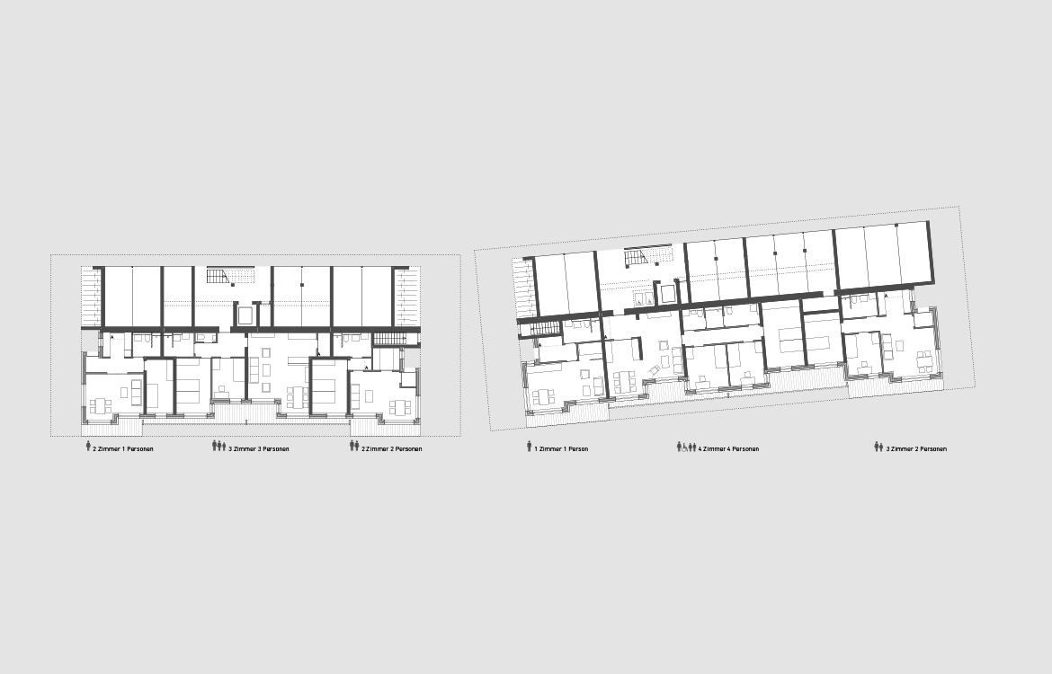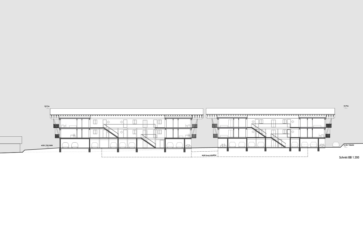 Die beiden Häuser nehmen die stadträumliche Linie des östlich angrenzenden Bauernhofes auf und schaffen eine klare Raumkante zur südlich angrenzenden Landschaft. Der „Wirtschaftshof“, der von den Wohnhäusern und den Carports bzw. Garagen entlang der Lärmschutzwand gefasst wird, dient als Erschliessungshof. Südlich der Häuser organisieren sich die Terrassen und Gärten der Wohnungen zur Landschaft hin. Die innere Organisation der Häuser richtet sich nach den schallschutztechnischen Anforderungen, die aus den Lärmemissionen der Beslerstrasse resultieren. Unser Konzept schlägt eine Laubengangtypologie vor, die das o.g. Problem geschickt umgeht. Die Aufenthaltsräume werden über die Giebelseiten und die Südseiten belichtet. Das nach Norden hin „unbewohnbare“ EG übernimmt die Funktion der PKW-Stellplätze. Die Organisation der Häuser als 4- bzw. 5-Spänner und die Ausbildung des 1. und 2.OG als Regelgeschoss gewährleistet eine wirtschaftliche Umsetzung des Projektes. Durch die oberirdische Anordnung der Stellplätze kann der Bau einer teuren Tiefgarage entfallen. Die Einsparungen, die über die strukturelle Konzeption der Häuser realisiert werden, können in die von uns vorgeschlagene und in den örtlichen Bauvorschriften geforderte Materialität und Gestaltung der Häuser investiert werden.