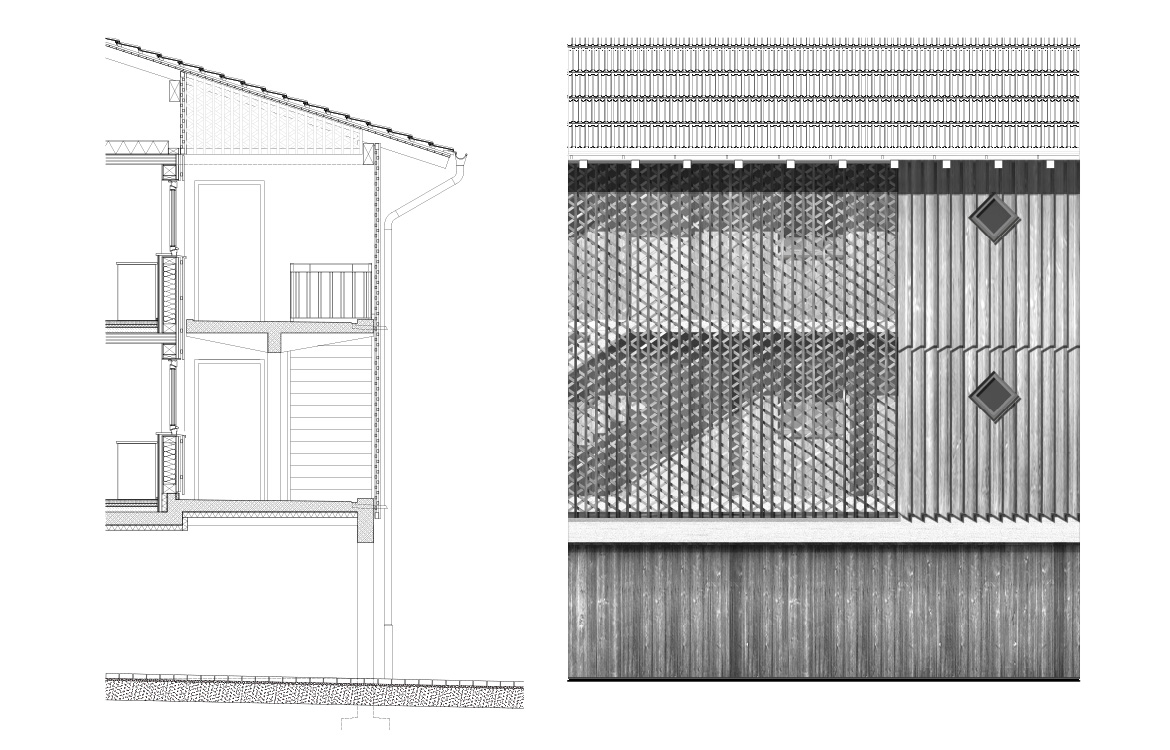 In ihrer Materialität, Konstruktion und Erscheinung orientieren sich die Häuser an der traditionellen Bauweise im Allgäu. Bei der Konstruktion wurde großen Wert auf Nachhaltigkeit, Langlebigkeit und geringen Ressourcenverbrauch gelegt. Die Außenwände bestehen aus einer gedämmten Holzständerkonstruktion mit hinterlüfteter Lärchenschalung. Somit kann ein hohes Maß an Vorfertigung realisiert werden. Sowohl die Trennwand zwischen den Stellplätzen und den Wohnungen im EG als auch die darüberliegende Decke wird in Stahlbeton ausgeführt, um die Wohnungen vor der Brandlast der Autos zu schützen. Die Laubengangdecken und die Treppen werden auch aus Gründen des Brandschutzes in Stahlbeton ausgeführt. Die restlichen Decken bestehen aus Brettsperrholzelementen. Die Wohnungstrennwände werden in Massivbauweise erstellt und steifen die Konstruktion aus. Das unausgebaute und ungedämmte Dach dient als Klimapuffer für die darunterliegenden Wohnungen. Das für den Laubengang und die Balkone vorgeschlagene Bundwerk ist ein architektonisches Element, das im bayerischen und österreichischen ländlichen Raum bei bäuerlichen Wirtschaftsgebäuden eingesetzt wird. Im Bereich der Laubengänge schafft es funktional einen optischen und schalltechnischen Filter zur Beslerstrasse. Gestalterisch vervollständigt es die klare Kubatur der Häuser und lässt die Fassaden nicht als banale Laubengangrückseiten erscheinen.